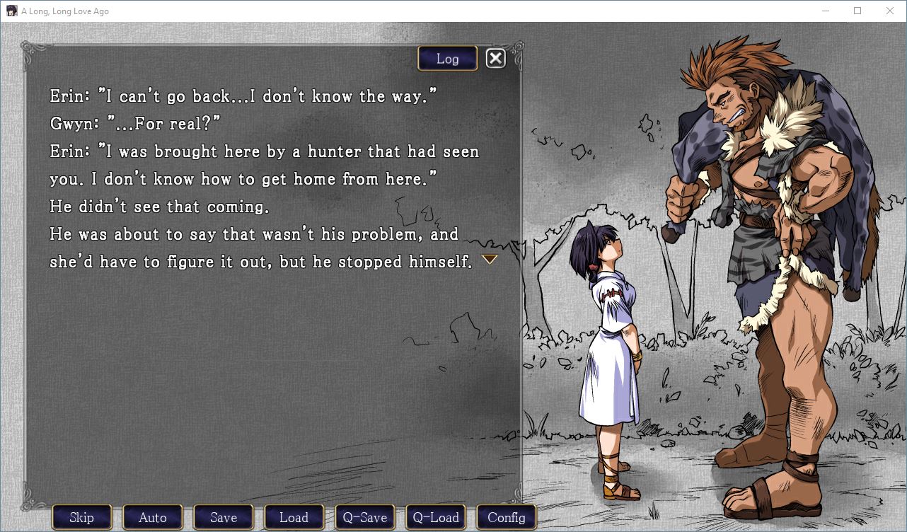 A Long, Long Love Ago is OTUSUN LAND’s newest title, a short visual novel about the relationship that forms between an unlikely couple. After young, grizzled giant Gwyn has a chance – or perhaps not-so-chance – encounter with waifish Erin in the forest, their lives quickly become intertwined. The story offers a few glimpses into their blossoming friendship, and is fully voice-acted in Japanese.​