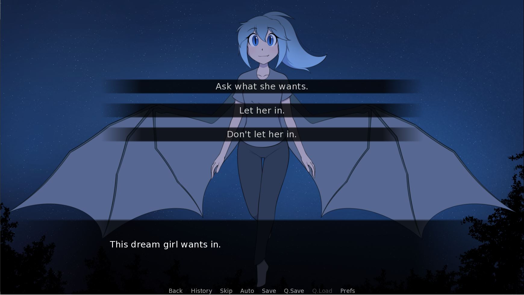 A Night with a Bat Girl is a short game with a large number of branching paths and endings about a bat girl named Dreamscape who’s looking for somewhere to spend the night when she ends up at your bedroom window.​