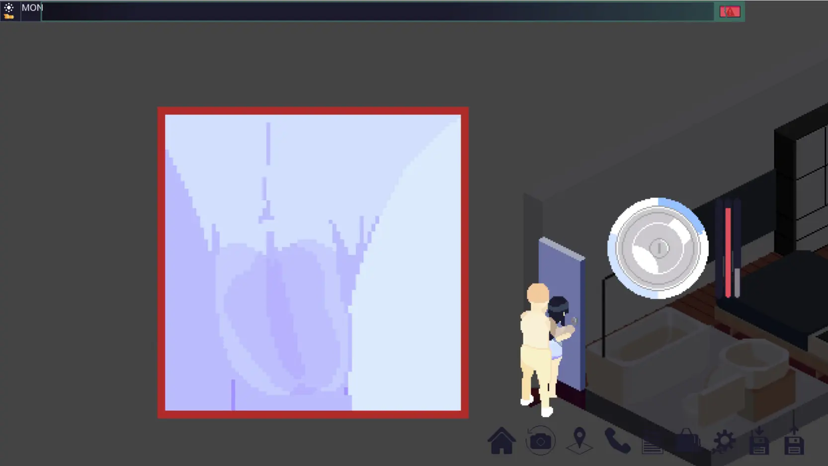 - Animation indicating how to activate the camera scroll functionality upon first entering the security room area.