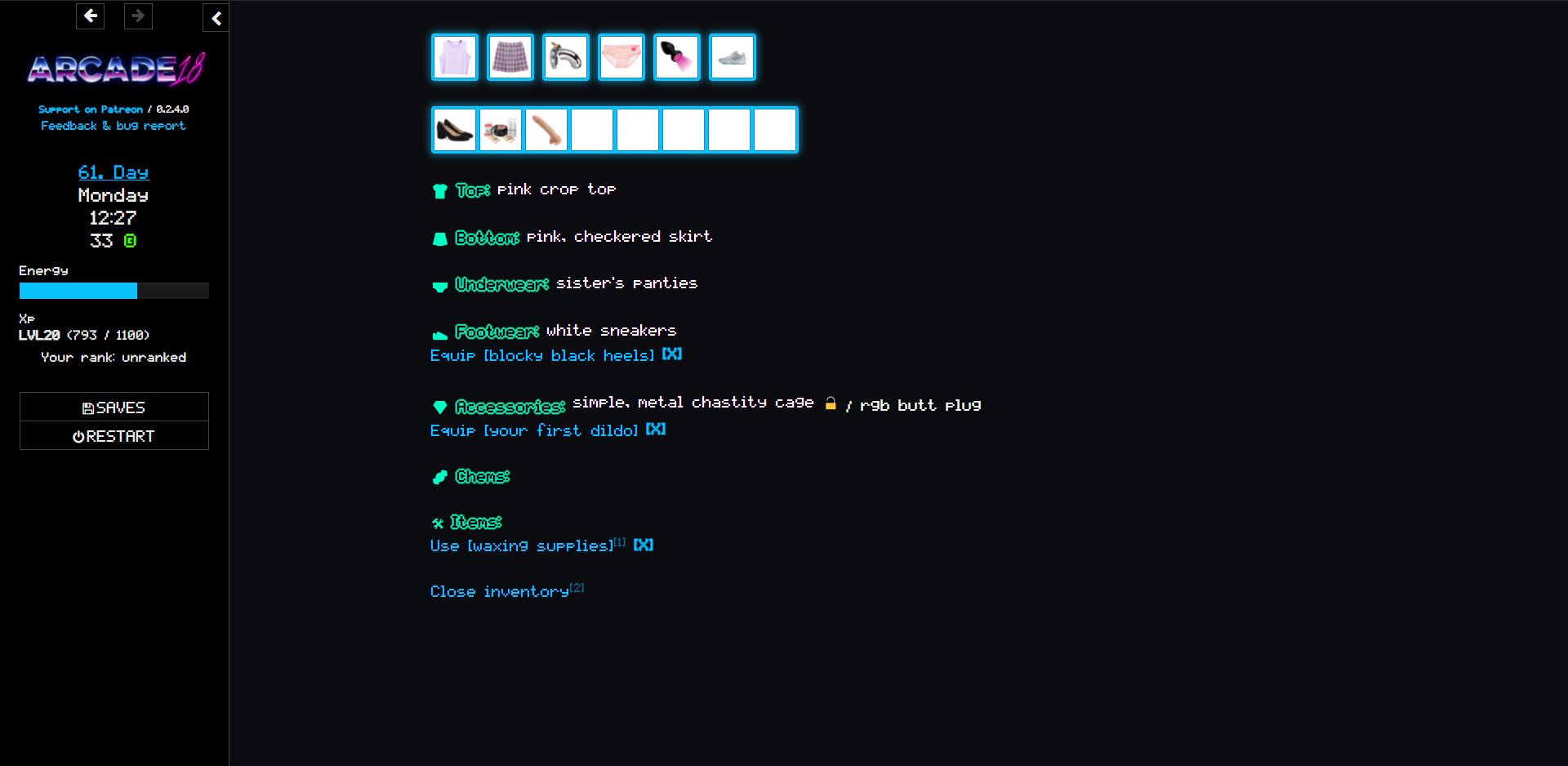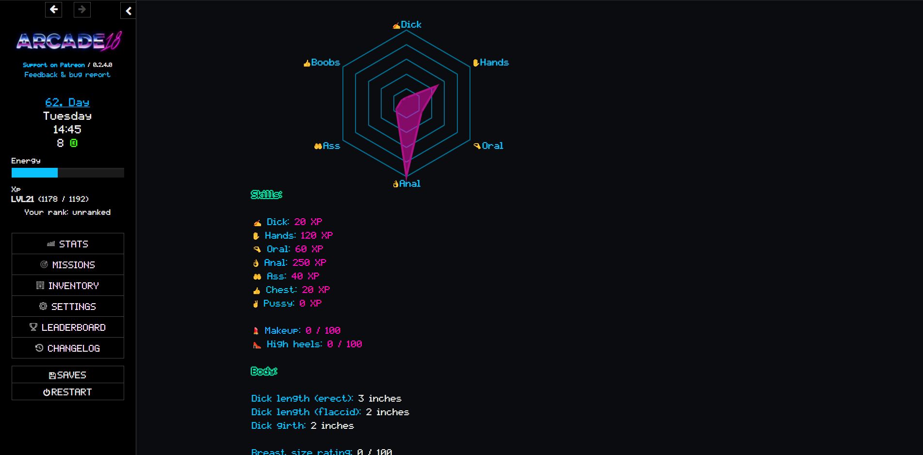 You’re a student soon finishing school, spending your days in the year playing VR games in the year 2118. You gain access to an adult entertainment facility a lot more real than the simulated games you were playing so far. Here players gain XP and level up for fucking, not for fighting. Players can be either dominant alphas or submissive betas, depending on which you choose your relationship with your principal (Scarlett) – who you also find here – will develop different. As a beta she’ll blackmail you into following her orders, you’ll become more feminine and submissive as you do. As an alpha, you can turn the tables around and blackmail her into following your orders. Other characters might also influence your journey along the way. (Note: the game is more focused on submissive gameplay at the moment.)​