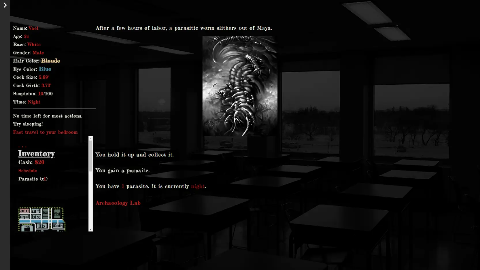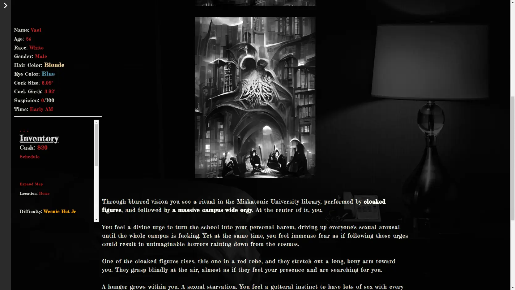 Artifact is a Lovecraftian adult text adventure coded in Twine. It is currently in alpha, and is early access.