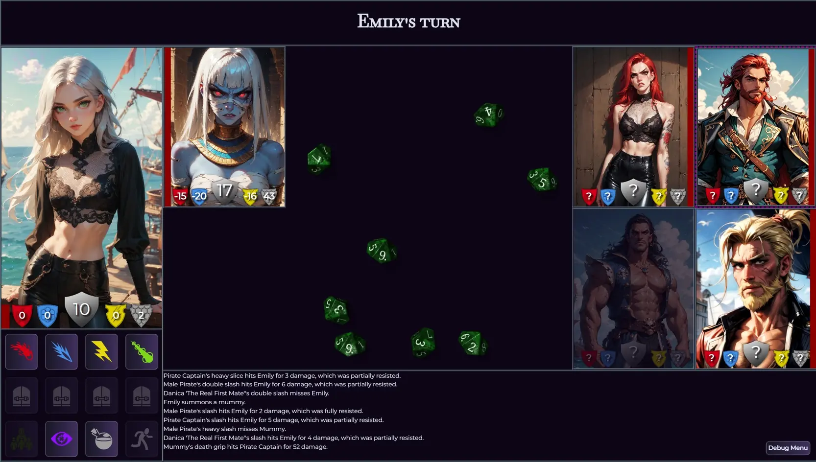 Finally help her through difficult dungeons using a custom D20 based combat system, where you get to use Emily’s increasing powers and summons to battle pirates, undead, bandits, minotaur, dragons and other fantastic like creatures.​
