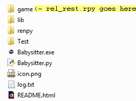 rel_rest.rpy file from inside the zip archive goes into the 'game' subfolder in the game root folder: