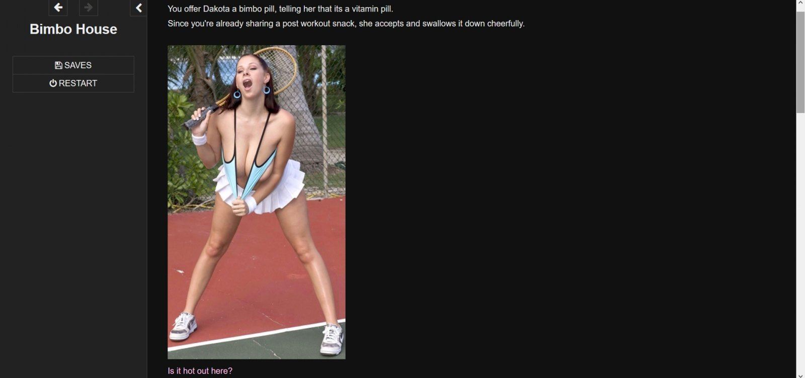 Currently I have two contestants fully implemented and tentative plans for third. I’d love to hear ideas for the fourth contestant. The current contestants are fully implemented with at least 4 unique encounters in each location they appear and random encounters that slowly bimboify the player character.