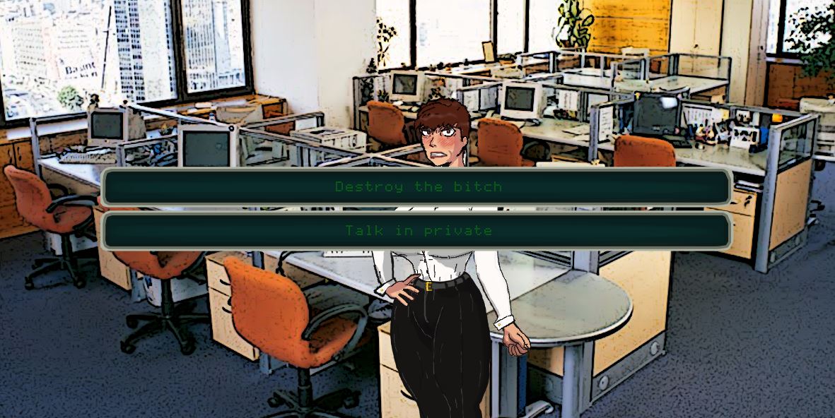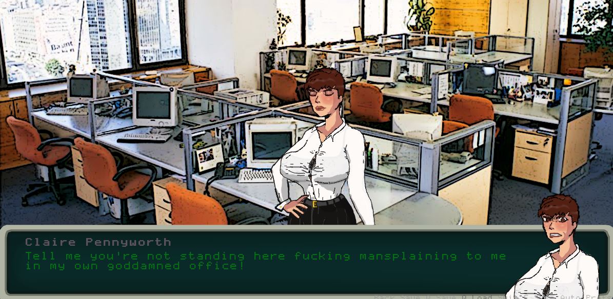 Bitch Breaker is a 1980’s themed “Slave Trainer”, a genre of games popularized by a very gifted artist and creator named Akabur wherein the game’s protagonist “trains” another character in sexual slavery, most often against their will. In Bitch Breaker the player takes on the role of an unpaid intern named Max Power who is forced to work for the summer at a sleezy 80’s megacorp where he trains his cruel, overbearing boss, the titular Bitch.​