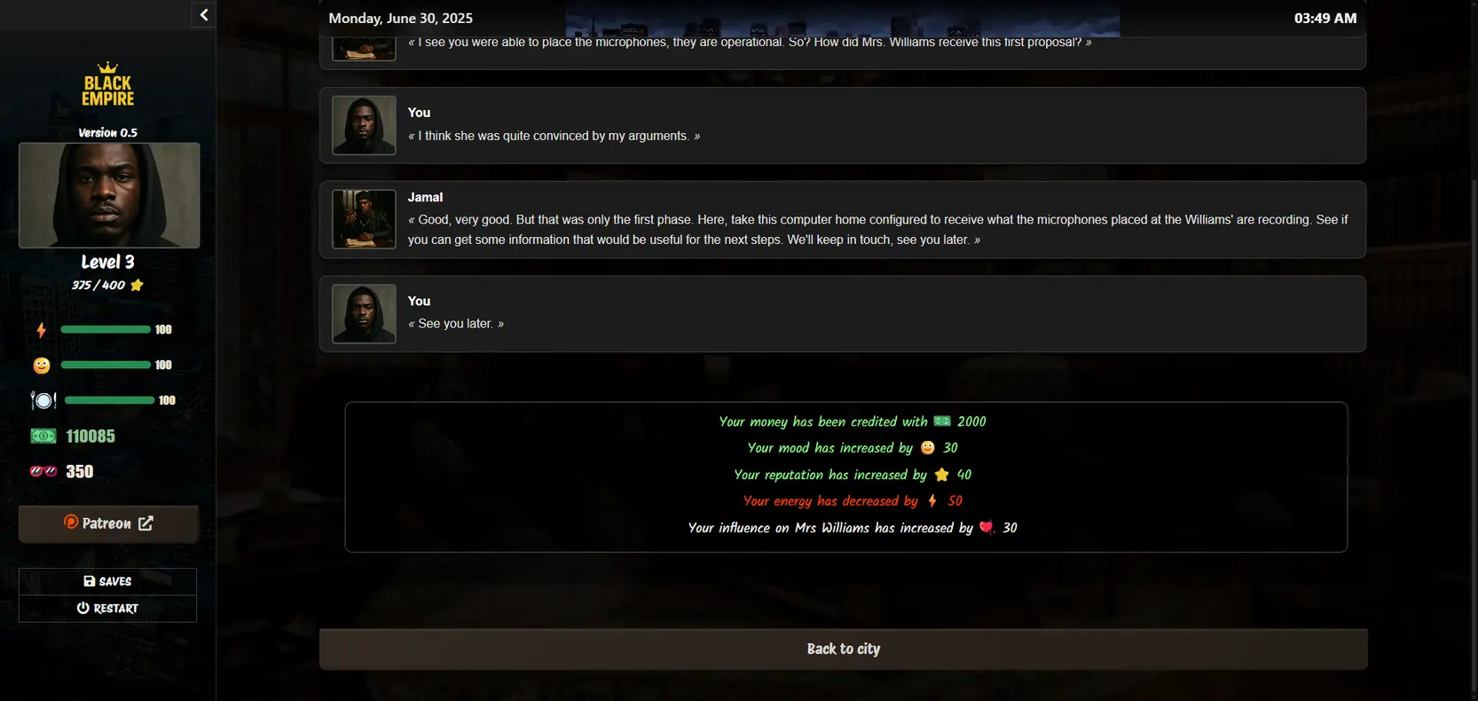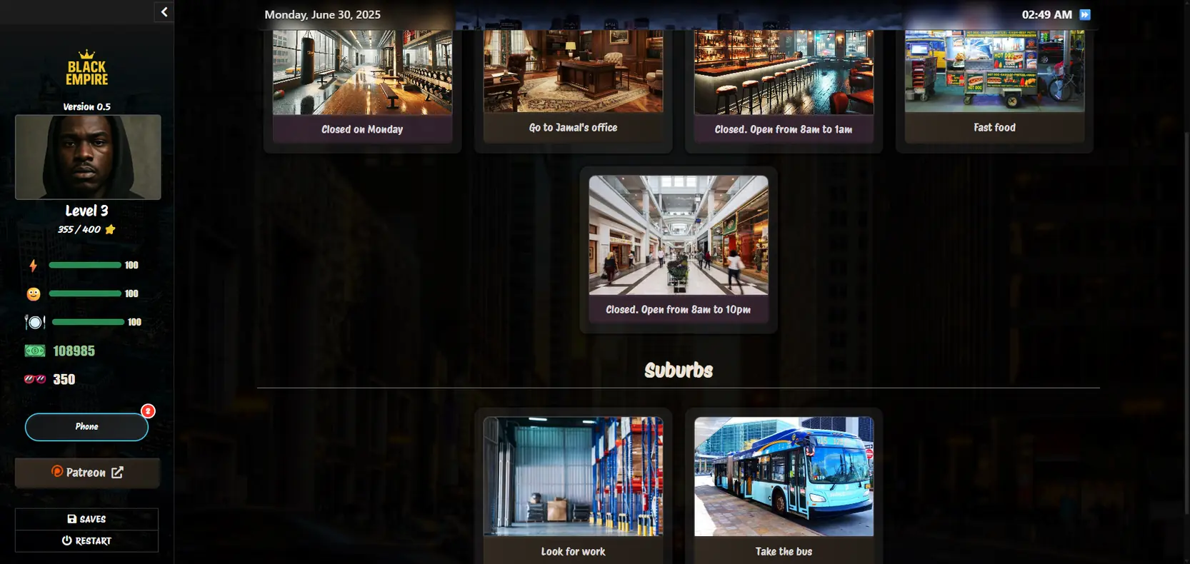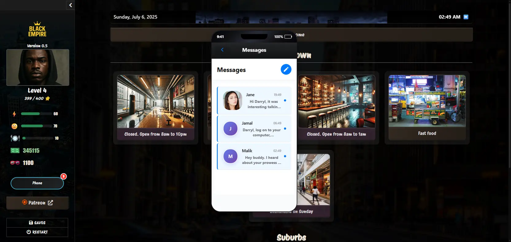 Welcome to Black Empire, an urban RPG that evolves the main character in a world full of temptations and opportunities!