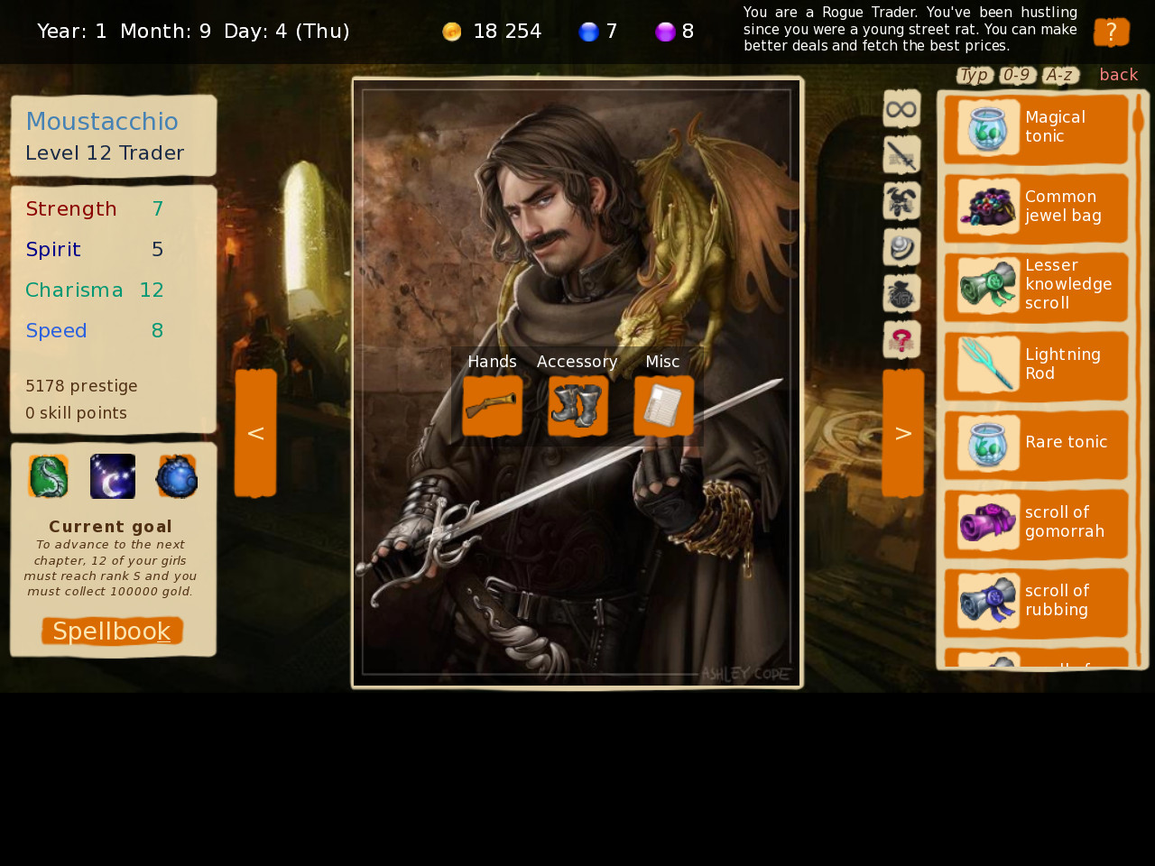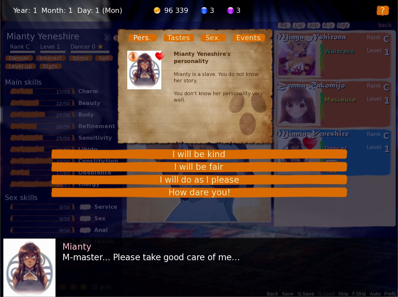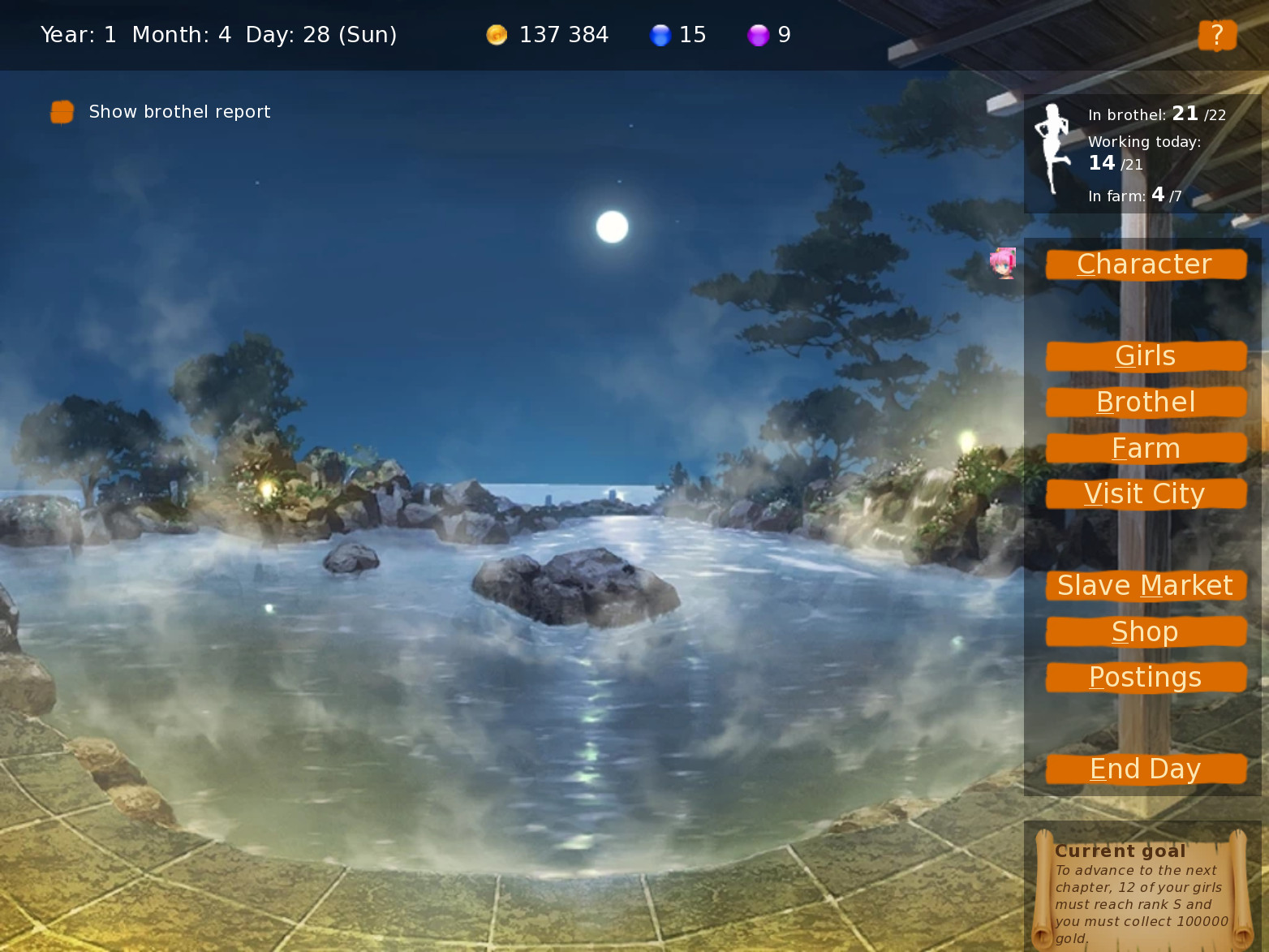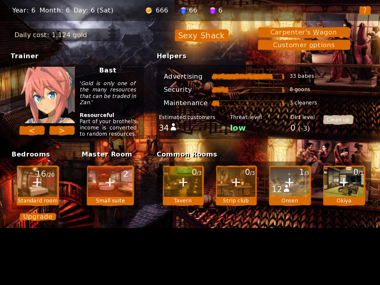 Brothel King is another take on Sim Brothel and gets some inspiration from other games, such as Slave maker. It’s made with Ren’py, my objectives being to make a fun game with a clean UI, good art and a full back story (which isn’t yet developed).​