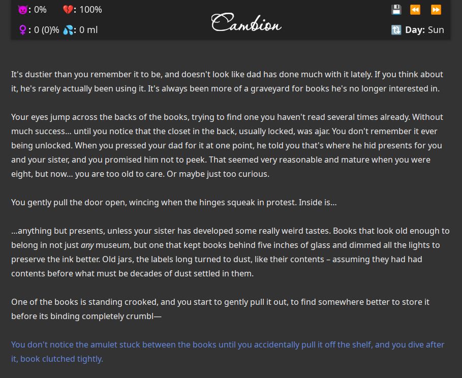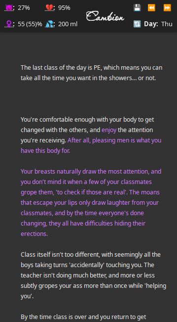Cambion aims to be a pretty straightforward M2F transformation game. A boy finds himself accidentally summoning a succubus – who takes advantage of his cluelessness and binds him to her, rather than the other way around as usually.