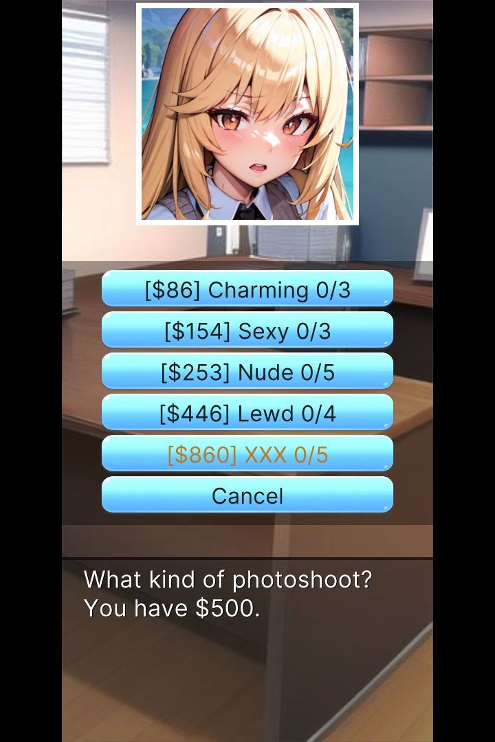 In Chara CardMaster, your goal is to take pictures of Charas. But not any picture, because it has been found out that the lewder the picture, the more money you’ll get! Buy upgrades, manipulate Charas’ popularity, and see more than 300 mini-scenes, each with its own picture!​