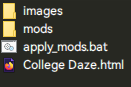 mods folder and College Daze.html file, and then rename College Daze.html.vanilla to College Daze.html.