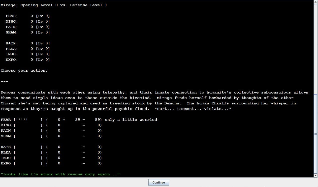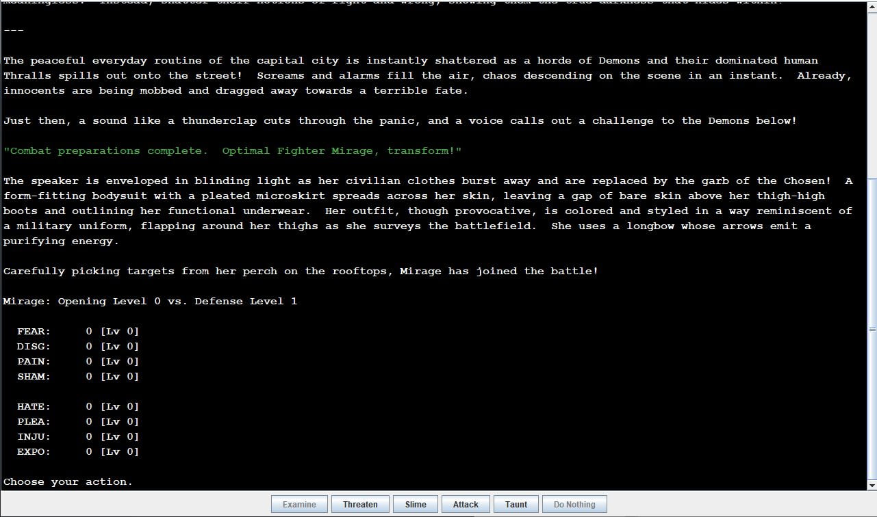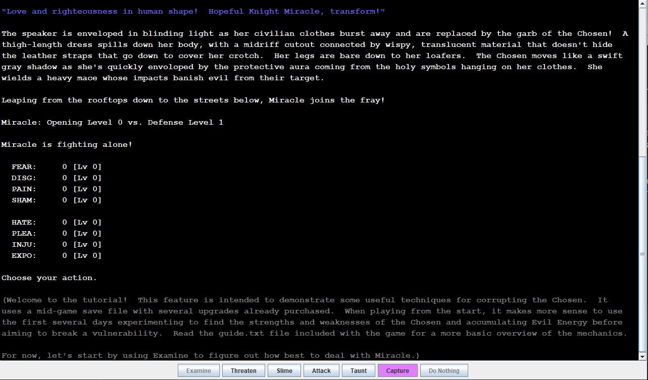 Corrupted Saviors is an erotic computer game where the player takes command of an army of Demonic tentacle monsters empowered by sin against a squad of superhuman opponents who represent the virtues of humanity. These Chosen warriors are overwhelmingly powerful, but they’re still human, and they respond to trauma in accordance with the facets of their generated personalities. By carefully tailoring the inflicted trauma to the target’s personality flaws, the player can turn them against each other and tempt them to greater sins in order to generate more energy for the Demonic army.​
