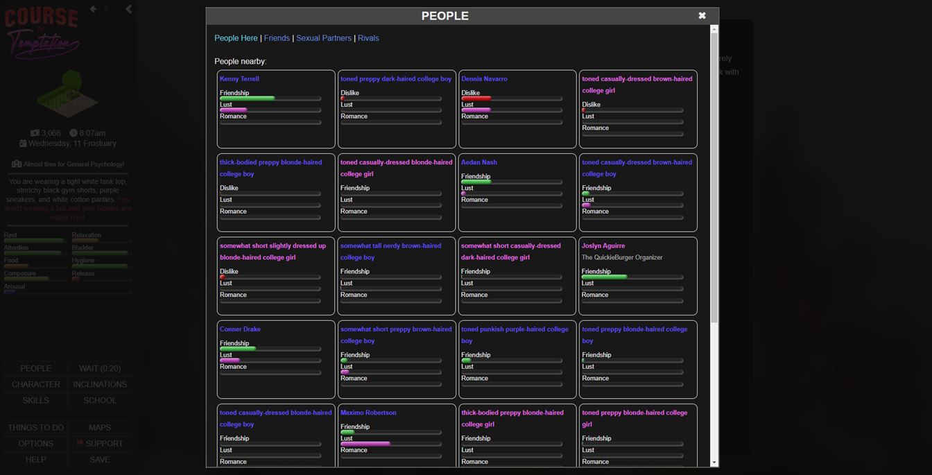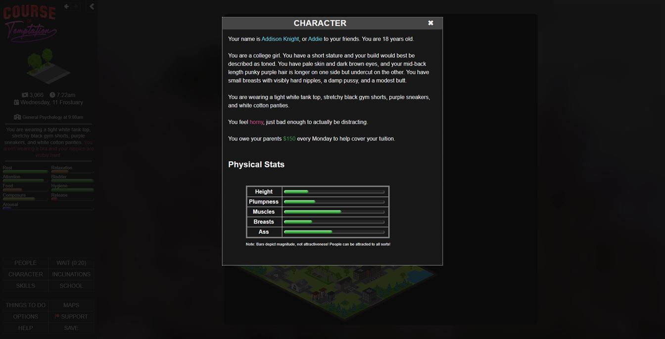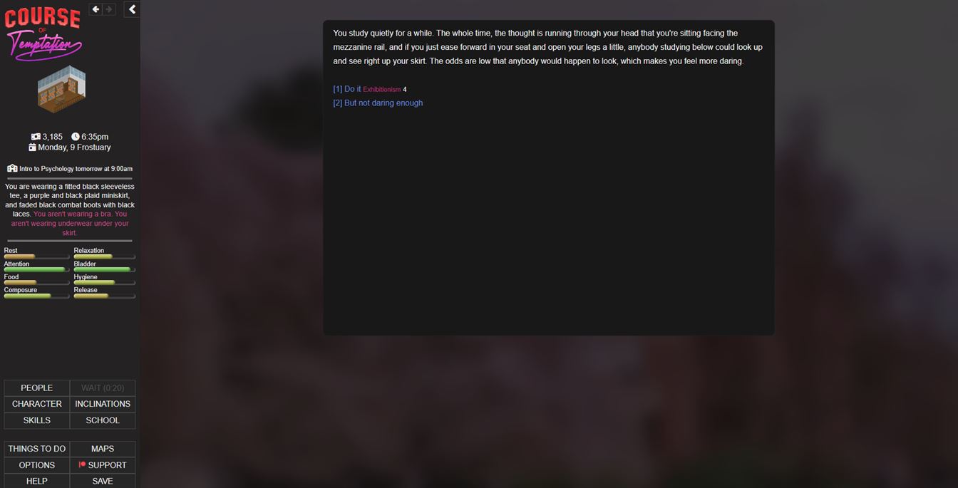 Course of Temptation is a detailed adult college life simulator. It’s text-based and runs right in your browser.