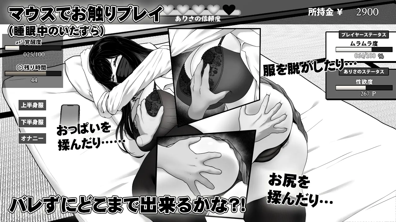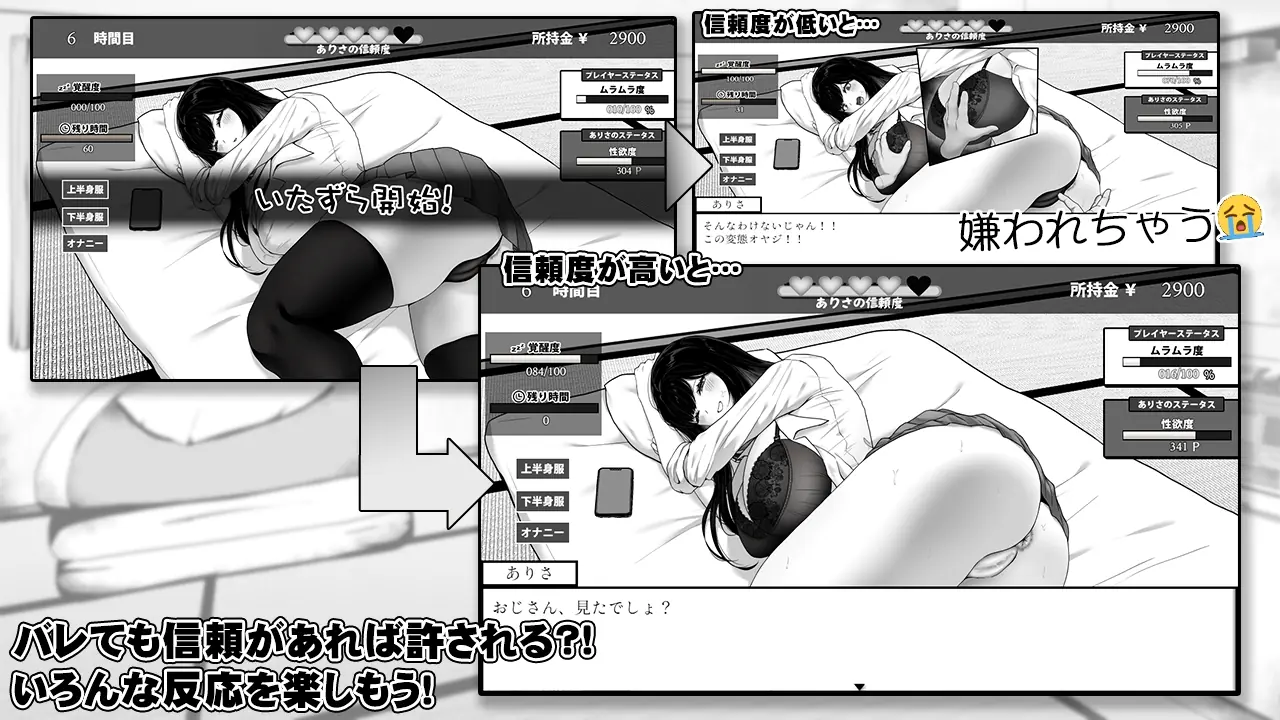 You (The Janitor) is a sexually frustrated janitor. He’s never had much experience with women, and his encounters with Arisa have only intensifies his desires. Desperate to connect with her, he tries different ways to bridge the gap between them.