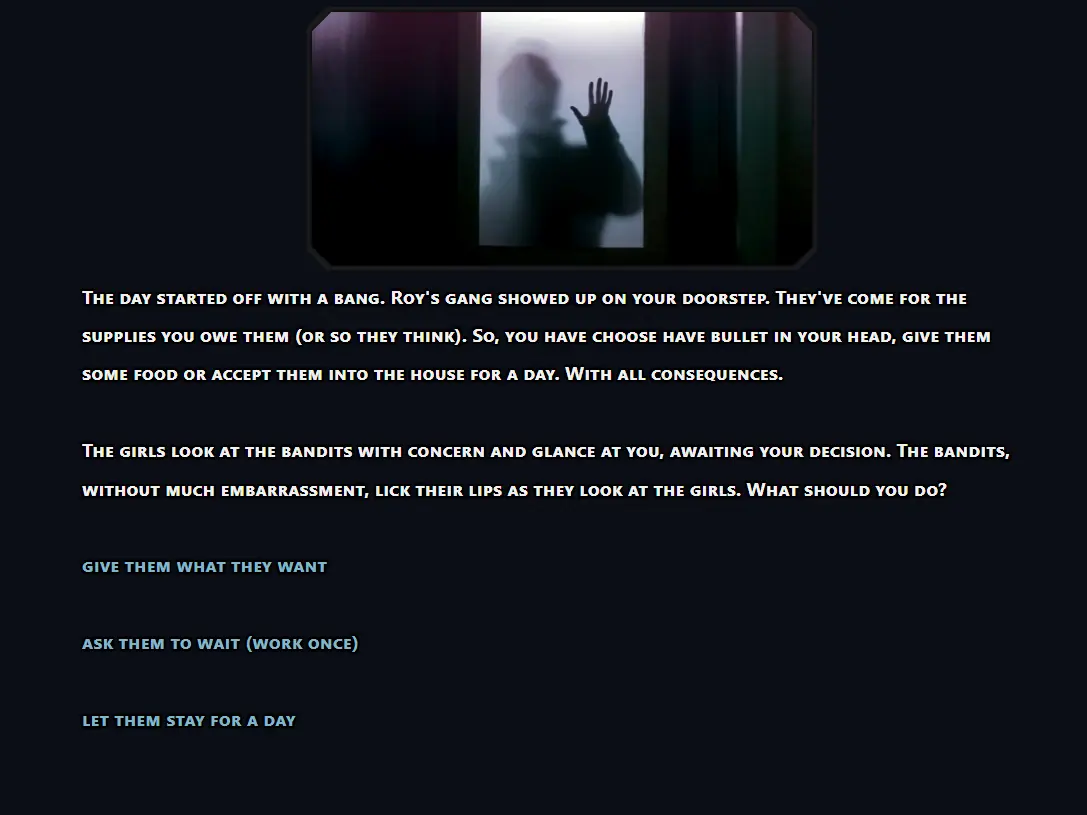 You take role of MC (Most Cool) – man who leave in the City. Not so long ago, the city was struck by an epidemic of a strange disease after which it was closed off, and most of the residents became infected or fled. As the MC you need to find your family in the City and then protect them from any threats. For now you stuck with two saved girls in house and you need to find a way to protect them too. So-o-o… is gonna be kinda busy.