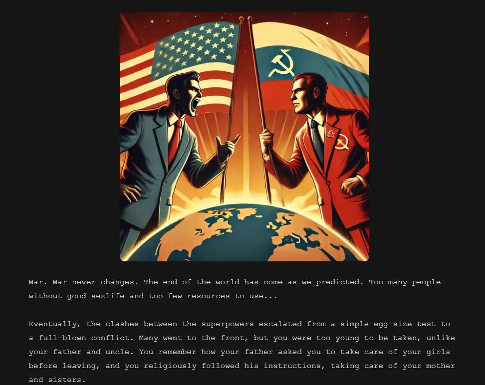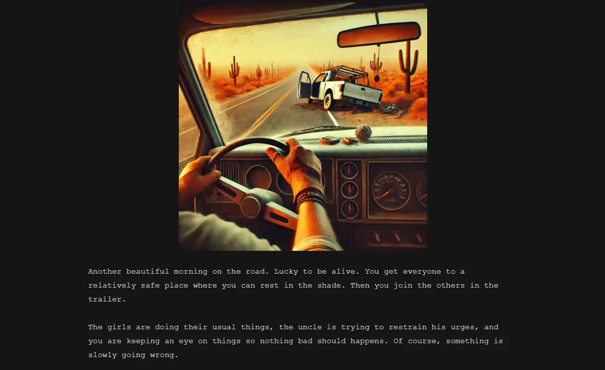 This is a story about a young man traveling with his family through a post-apocalyptic wasteland. His uncle urgently needs help to escape from a virus that makes the old man go crazy and try to fuck all the girls close to him. But whether you can help your family save themselves or perish in the abyss of lust – it depends on you. Although who am I kidding? Everyone will be fucked – the only question is who exactly and with whom!