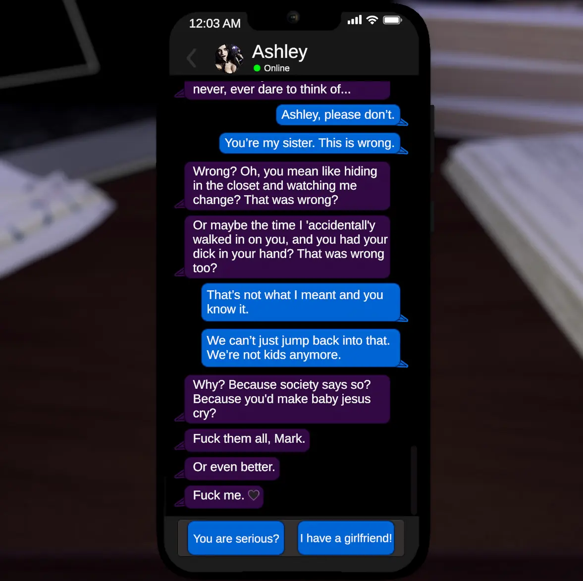 Your sister is a dangerous goth girl who won’t take no for an answer. She has her eye on you in this new Phone-Chat simulation. Can you handle her increasingly intense affection, or will you surrender to her twisted love?