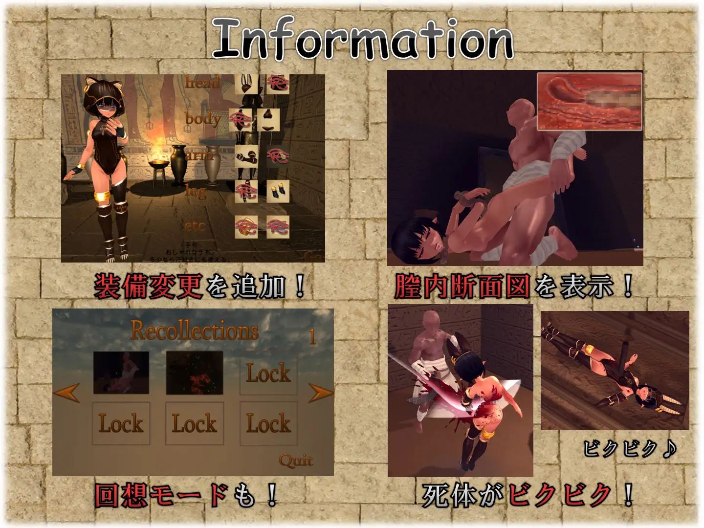 Start off by kicking the crystal and lasering the door to open it up. Run in and get relieved that the pharaoh or whatever is still there. Head to the room on the left side to get a new outfit. Head to the room on the right side down the stairs and read the book on the table to continue (the other two items in there aren't needed). Going back up the stairs you'll find that there are now thieves in the big room where the crystal was. Go out to greet them, and then make your choice for if you want to unlock more scenes or not. Going back into the room with the pharaoh has one of them chase you and get obliterated, making them aggro. It's really damn difficult to defeat them if you do this, since you're not allowed to attack from in there, despite them not following (ghost buddies will turn on you), and going back out you'll just get ran down by the darker thief on the left. If you get tackled by either of the darker thieves you'll get one of two scenes depending on if you killed any of the others (dude dying to ghosts does not count): they fill you with coins if they're all alive, or they beat you and completely carve you up into little pieces in a really visceral scene if one or more is dead (this one is not for the faint of heart). Go past all of them and down the stairs to where the stage started and you get the third scene by getting ambushed (this one is bugged for me on version 1.01). Easiest way to kill them is to walk past them before they're aggro, stand at the top of the stairs (not in the room, and not at the bottom of the stairs) and just laser them from there. Kill all of them and then go back to where the stage started to finish it.
