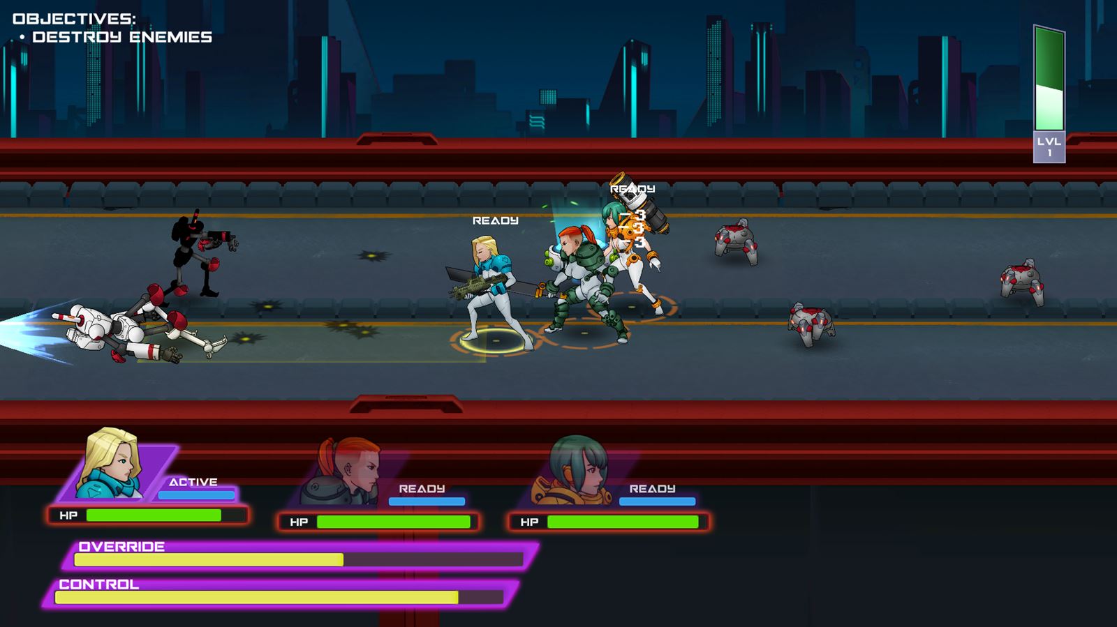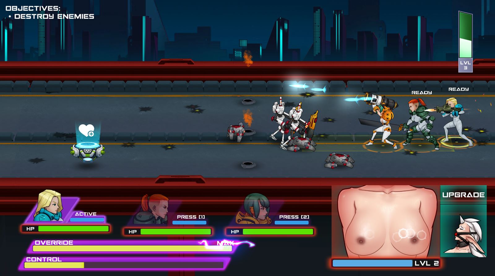 EroSquad is a cyberpunk side-scrolling-shooter in the vein of Azur Lane and Final Gear. Command a squad of cybernetically enhanced soldiers with different weapons from artillery to rifles to swords. Build up enough kills and you can perform an Override attack with special lewd animations to destroy enemies.​