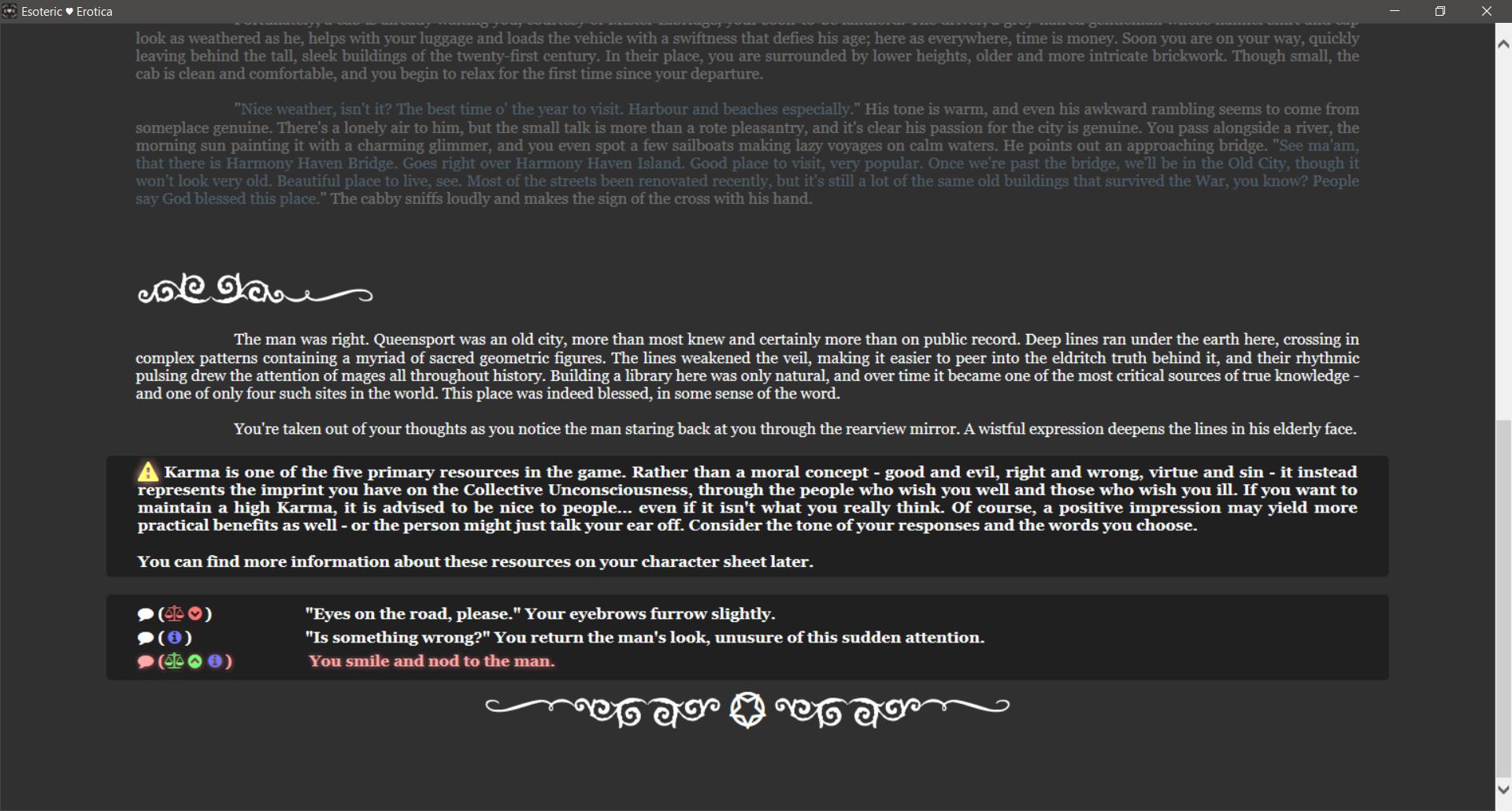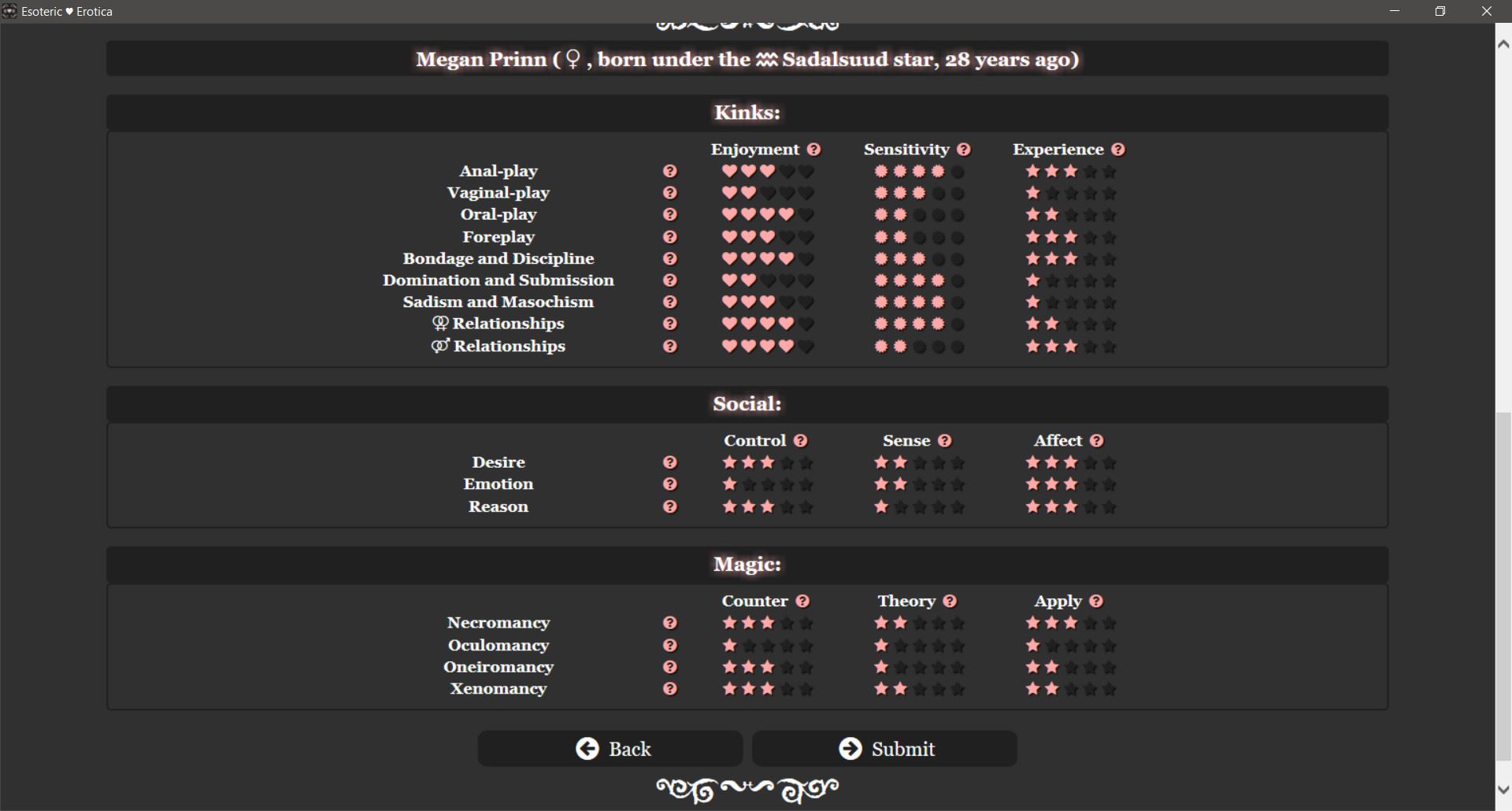 “Esoteric Erotica” is an adult game with a submissive female protagonist, focussed on Lovecraftian style mysticism and executed in a custom engine I have developed myself.