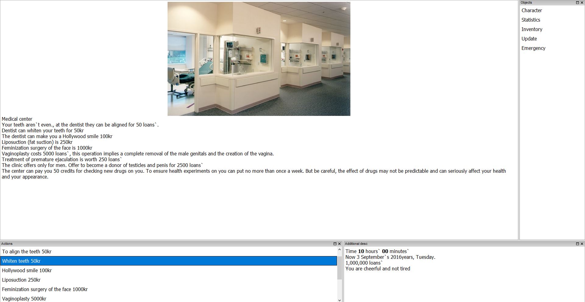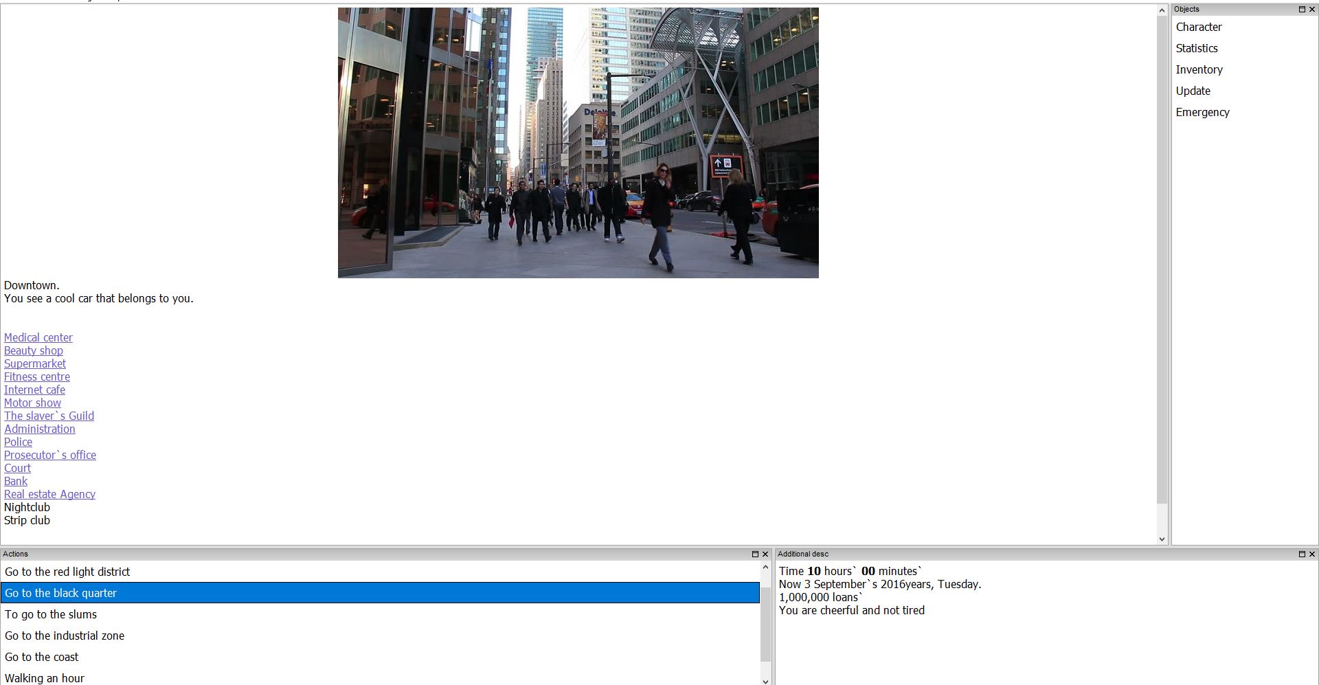 The game is quite original and not like other games. In the game, you can create a character as a man and a woman and start life in the capital. The action takes place in a kind of parallel world where everything is basically similar to our world, but there are also differences. In the course of the game you can, for example, create your own gang, you can trade in drugs, you can own a brothel and manage whores, engage in blackmail and, through acquaintances with the elite, turn things around, you can kidnap people and force them to sign slave contracts. The game has a wide range of actions and deep sex system. Just in spite of everything, the gameplay for a woman and a man is different, in this game it is possible to turn from a man into Shemale. The game is very important economic component, you can legally earn a penny at work, and you can create evil and on other people’s heads to climb to the top of the world. The choice is yours, there is no plot in the game and you don’t owe anything to anyone.