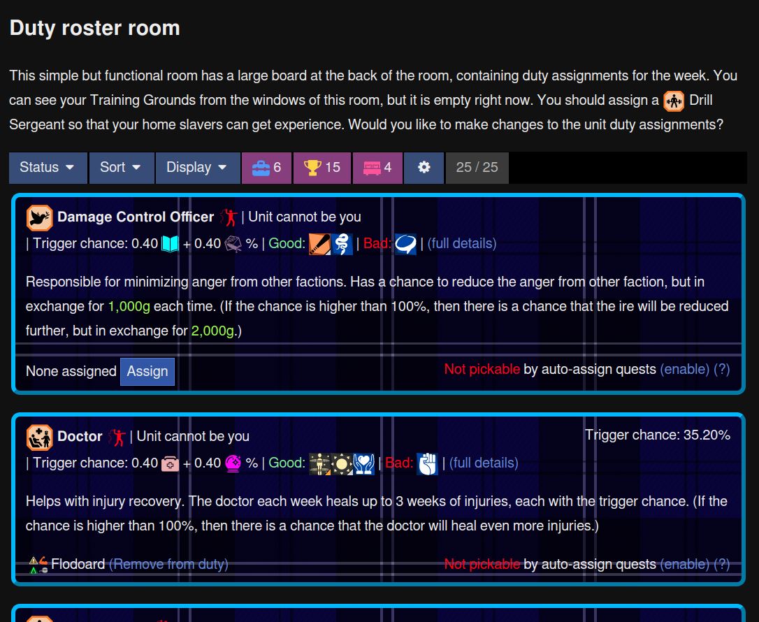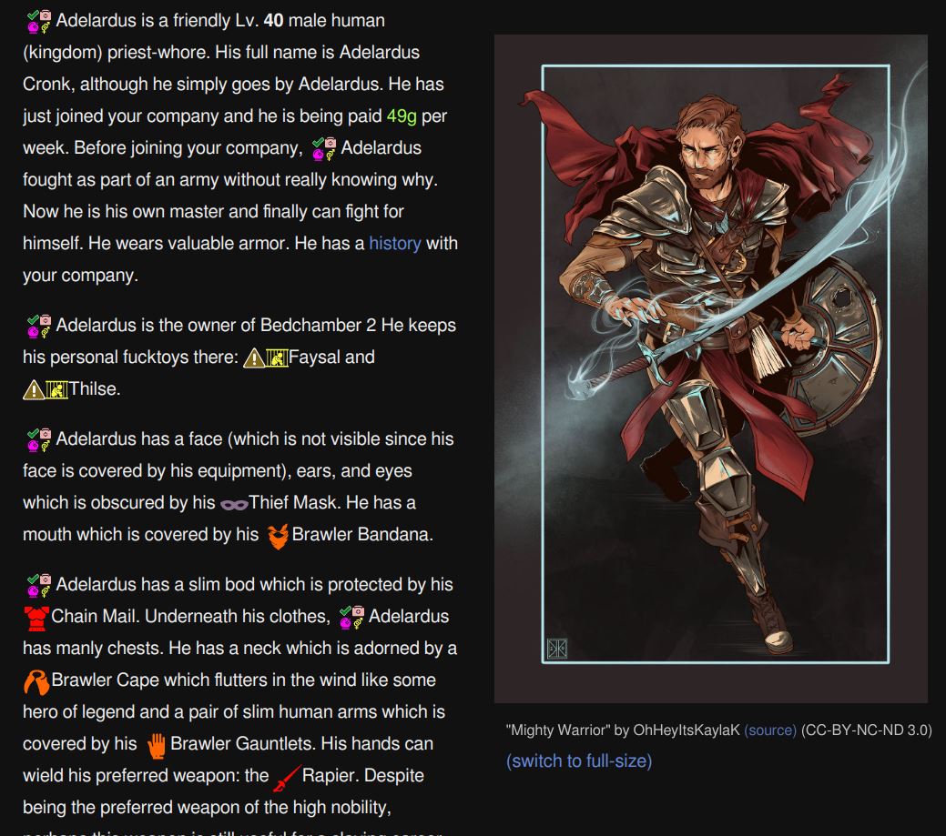Fort of Chains is a completed, free, moddable, open-source, TEXT-ONLY sandbox management NSFW game where you lead and manage a band of slavers in a fantasy world. The game is configurable and can cover all gender orientations: MM, MF, and FF. Be warned that the game contains heavy themes of slavery and non-consensual sex. There are no support for playing as a submissive character. (F.A.Q) (Fetish List)
