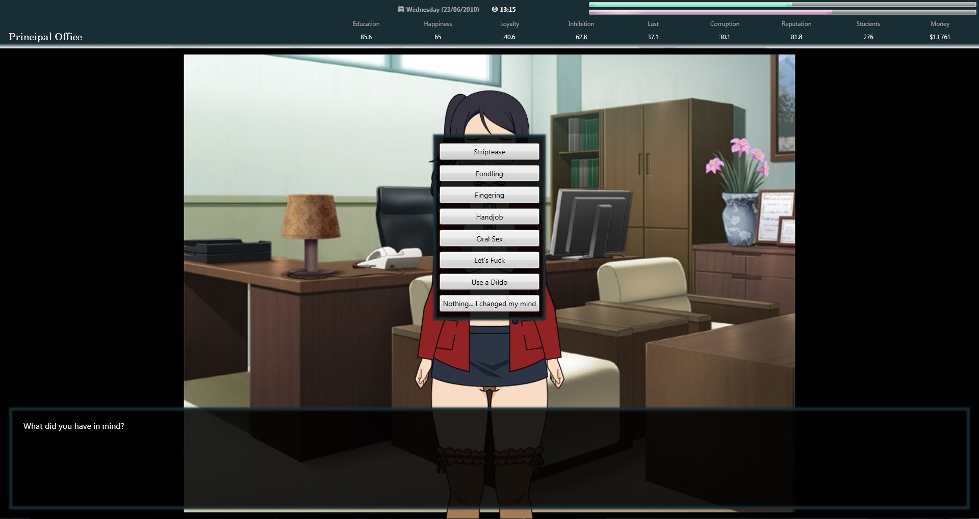 You are a new headmaster in a school. Your main task is to try to bring students up to a maximum stage of depravity. To do this you will have to convince the PTA to agree on changes that through time will help you achieve this goal. Several quests exist to help you achieve your goal.​