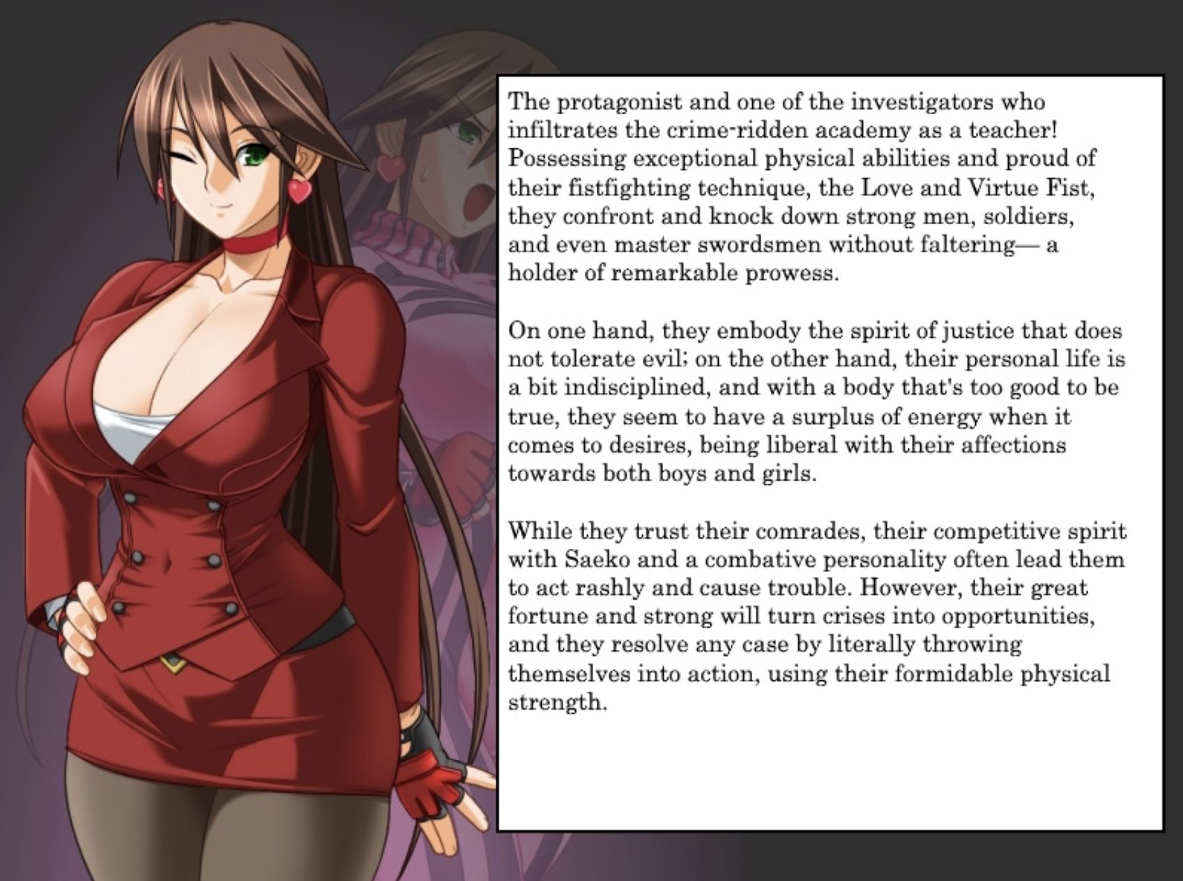 The protagonist and one of the investigators who infiltrates the crime-ridden academy as a teacher! Possessing exceptional physical abilities and proud of their fistfighting technique, the Love and Virtue Fist, they confront and knock down strong men, soldiers, and even master swordsmen without faltering— a holder of remarkable prowess.