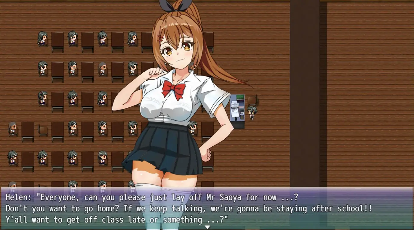 As Ichimotsu Saoya, a middle-aged physical education teacher, you witness your masturbatory crush, the recent international student Helen Anderson, having sex with a student from another class, Ninomiya.