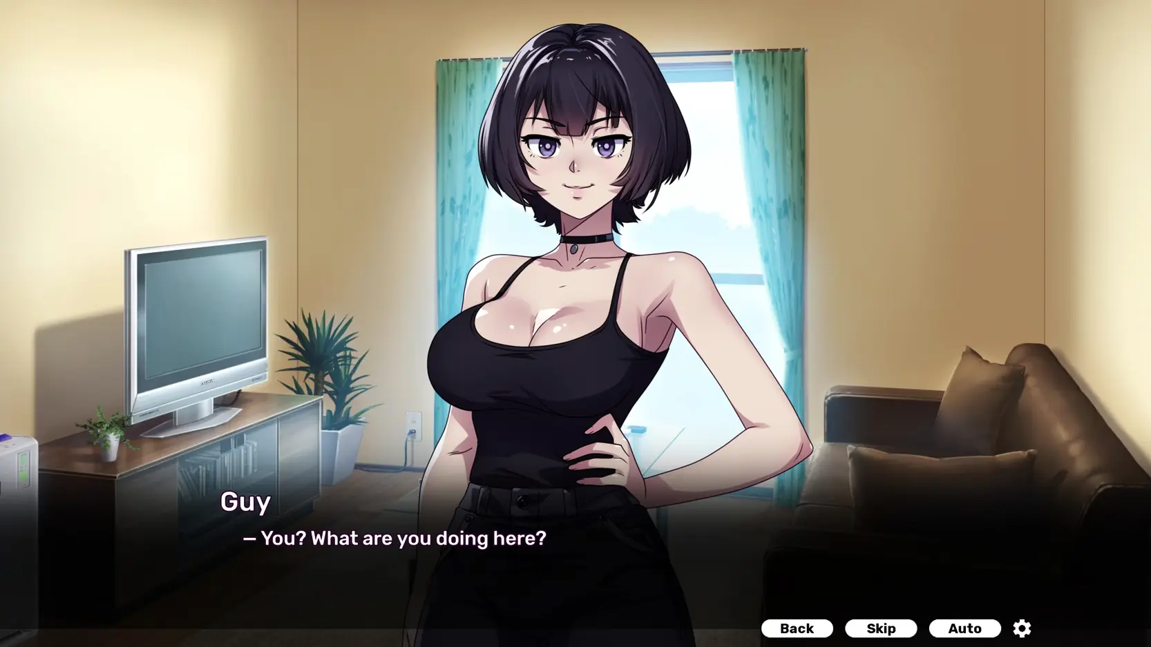 You dashed into the first apartment you could find, trying to escape the sudden downpour—and here’s the result: a slamming door, an unfamiliar interior, and… her. Tall, with dark hair cascading to her shoulders, wearing a tight black dress and a faint smirk. She seems like an ordinary woman, but something in her gaze sends a shiver down your spine.