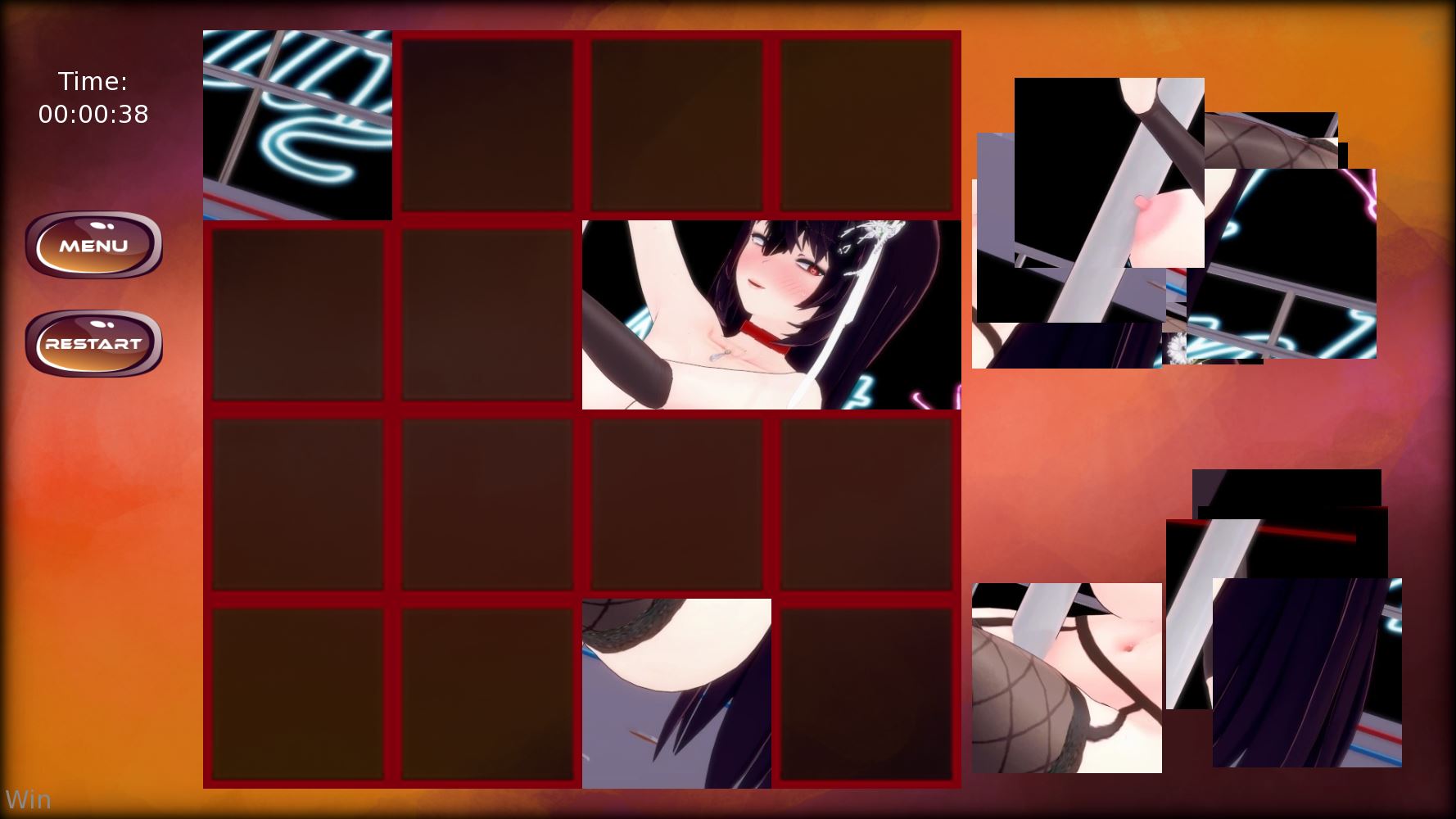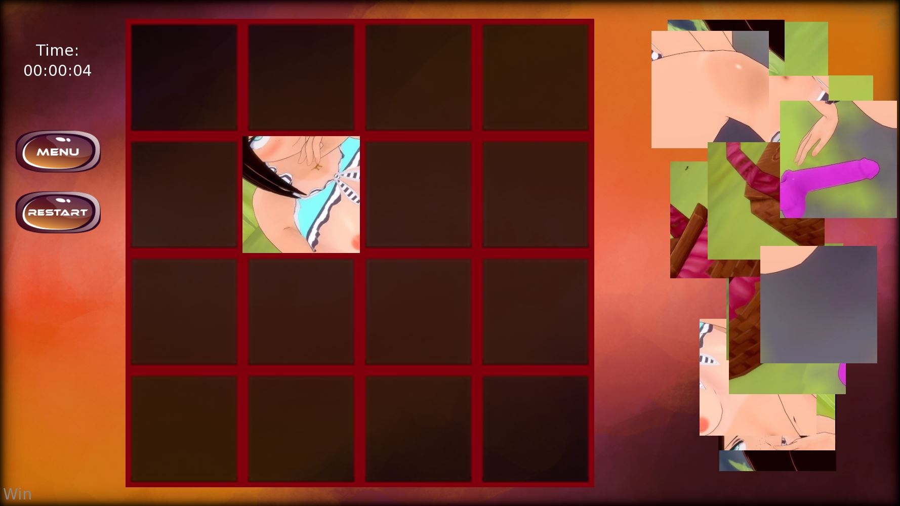 Jiggly Jigsaw is a puzzle game featuring 50 different jigsaw puzzles that you can complete, as well as a lot of breasts. There are three ways to select your puzzles (picking whichever you want, randomizing until you find one that suit your fancy, or going in blind), and you can play at 5 difficulty levels, ranging from easy, which is a 16 piece puzzle to expert level (400 pieces).