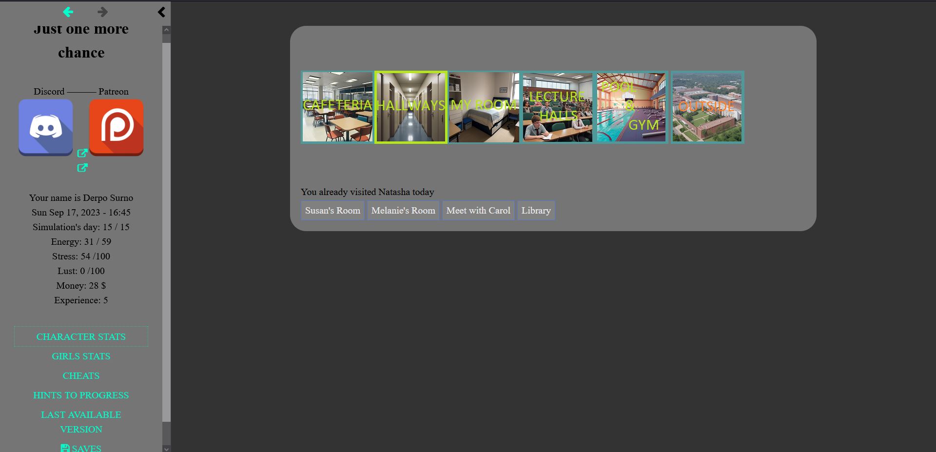 In this game you play as a desperate, virgin fat guy that in the future manages to become a test subject and gets back in time through a technologically evolving simulation and has a second chance to re-live his life in college, there will be several girls and woman with different level of challenge, different stories, and needing different approaches to seduce them all.