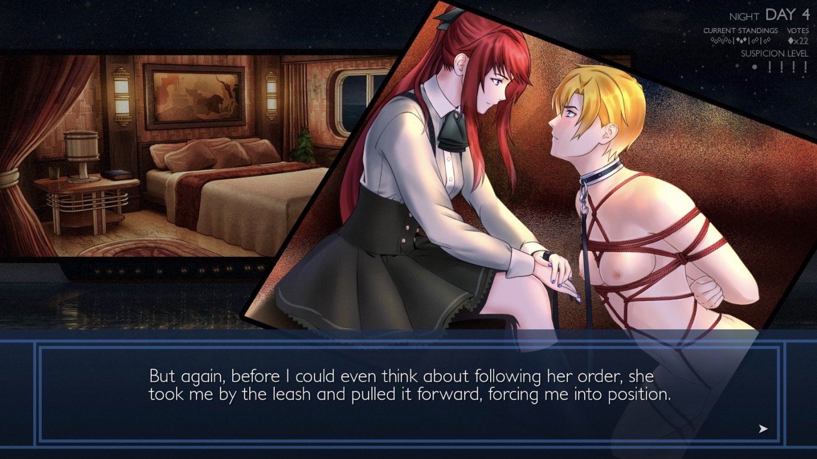 Forced to pretend to be her twin brother on a cruise ship full of his classmates and enemies, the Beast finds herself thrown into a game of complex social manipulation, as well as literal bondage. Can you win enough of their votes to get back the Beast’s motorcycle? Will you get locked up in cargo for doing too unconvincing an impression of the Beast’s brother? Or will you just spend the whole time brazenly getting the Beast’s pussy wet?