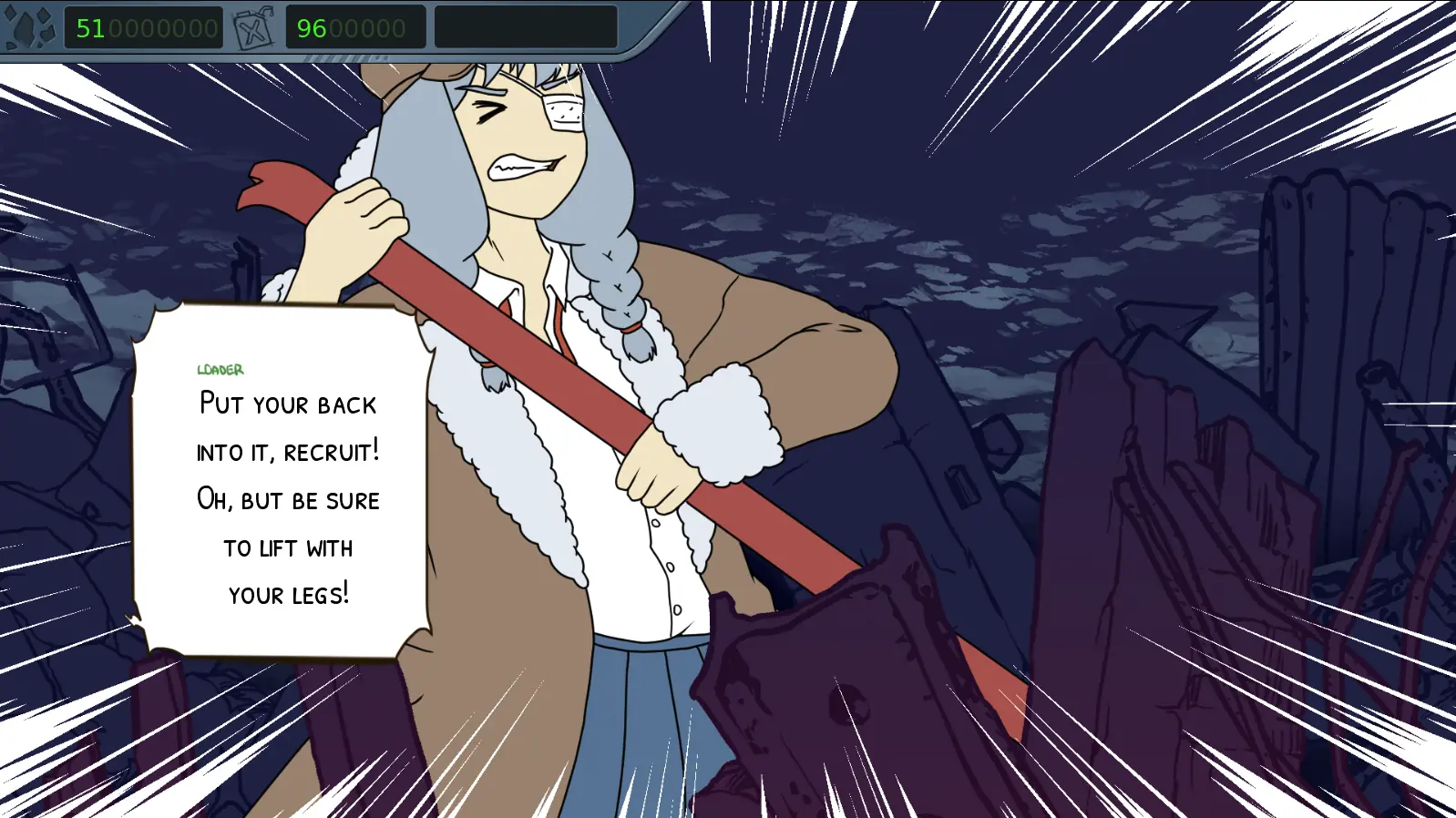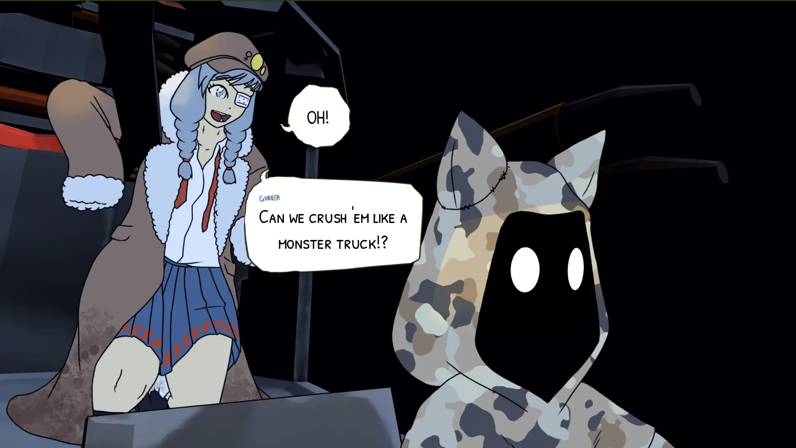 This month’s build of LC34SO: Tank Lesbians features the entire first act of the game, from the beginning of Gunner’s recollection of events to the first big reveal of what is to come, as well as a generous helping of highly-characterful random events.