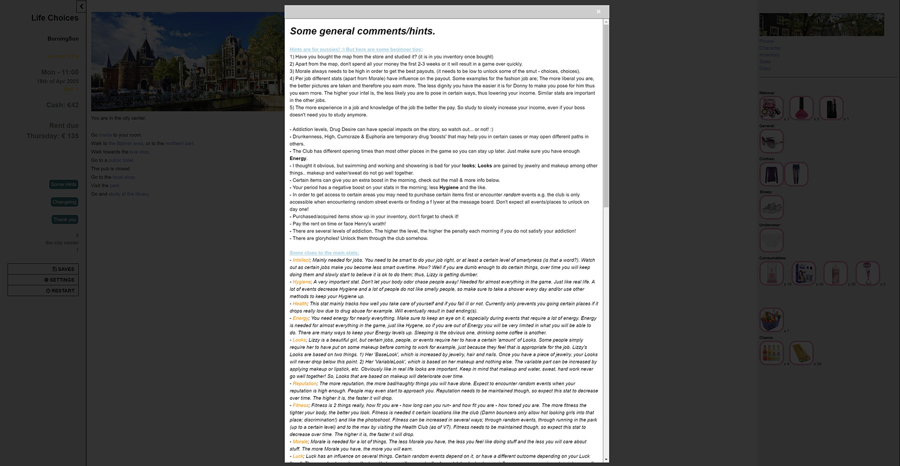 You’ve lived all your life in a small village adjacent to The Lake District. You never really been to a big city as mum and dad told you Liverpool and Manchester were full of dangers. But a week after you turned 17 you’re parents got divorced and you were forced to choose who to live with. There was no right or wrong choice, still whatever choice you wanted to make felt wrong, as if you were cheating on the other parent. So that is the start and a year later Lizzy ends up in Amsterdam. Will she be able to not fall into the dangerous downward spiral of drugs, sex, prostitution and the like? It is up to you.​