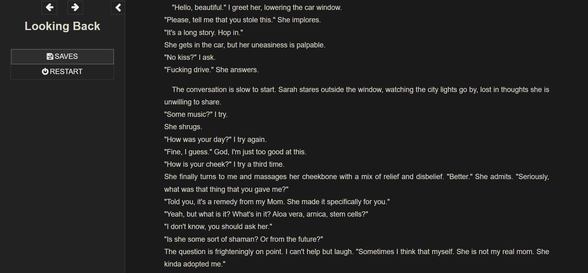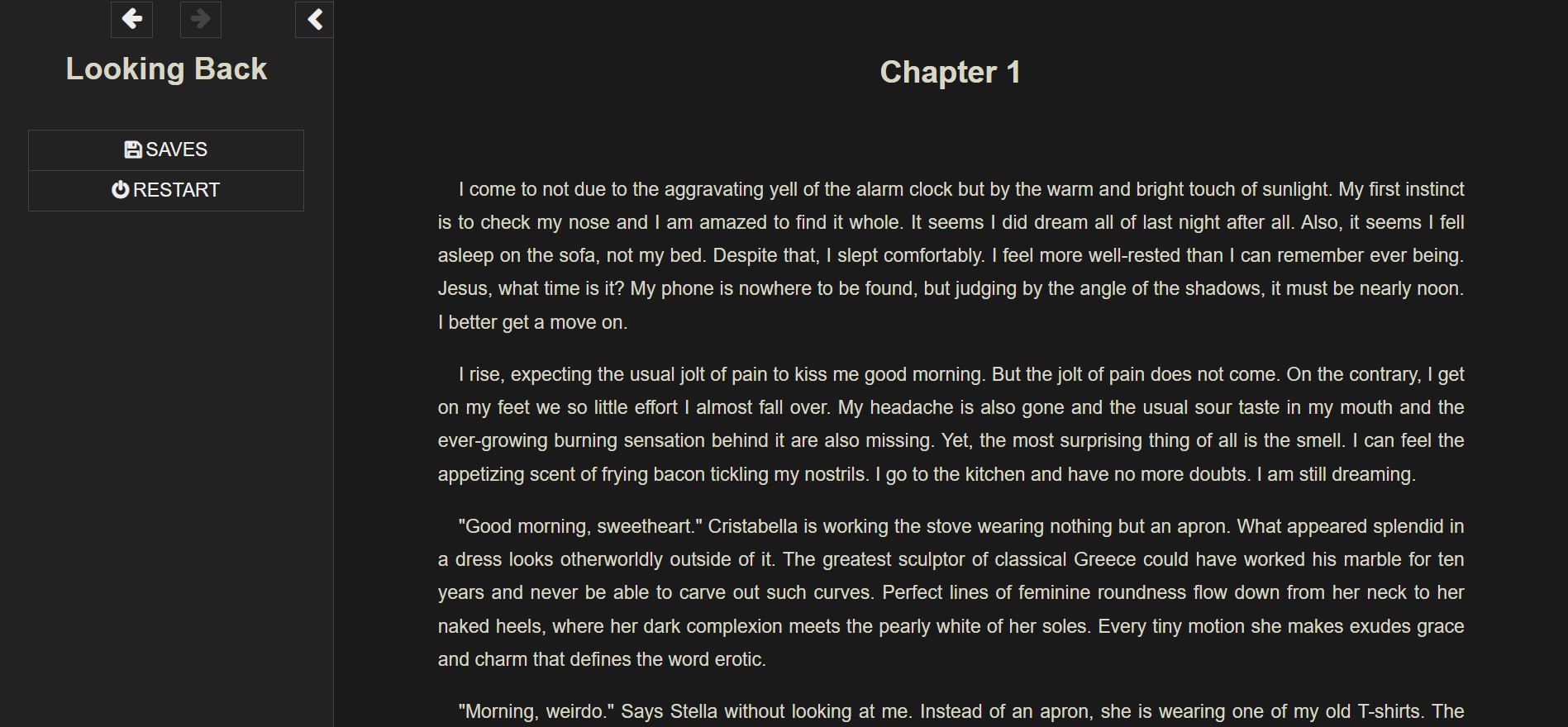 Looking Back is my personal spin on the Young Again genre, with a heavy focus on romance, deep heartfelt relationships, and hot steamy sex. There are three main mutually exclusive love interests, each very different from the others. It is a mostly linear experience, but there are several choices, some are insignificant but most are not. There are three endings, each with a significant variation, plus one secret and relatively well-hidden ending.