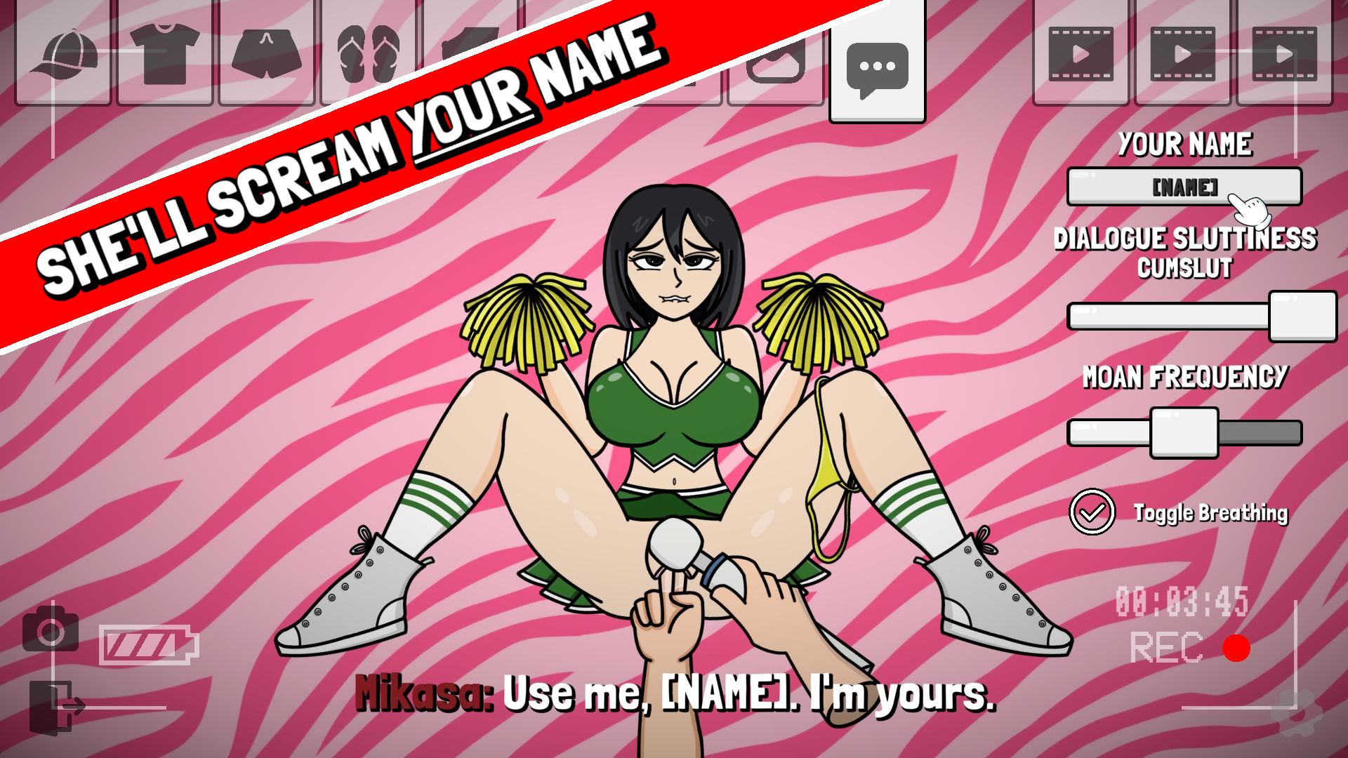 Dress up and fuck Mikasa in this 18+ NSFW parody game! With over 10,000 possible outfits, there’s something for everybody. Change the ‘Slut Meter’ to personalize her dialogue, or even set custom text to make her scream your name!​