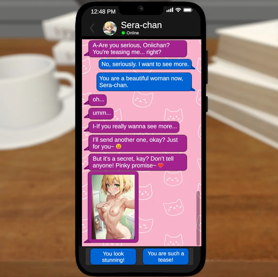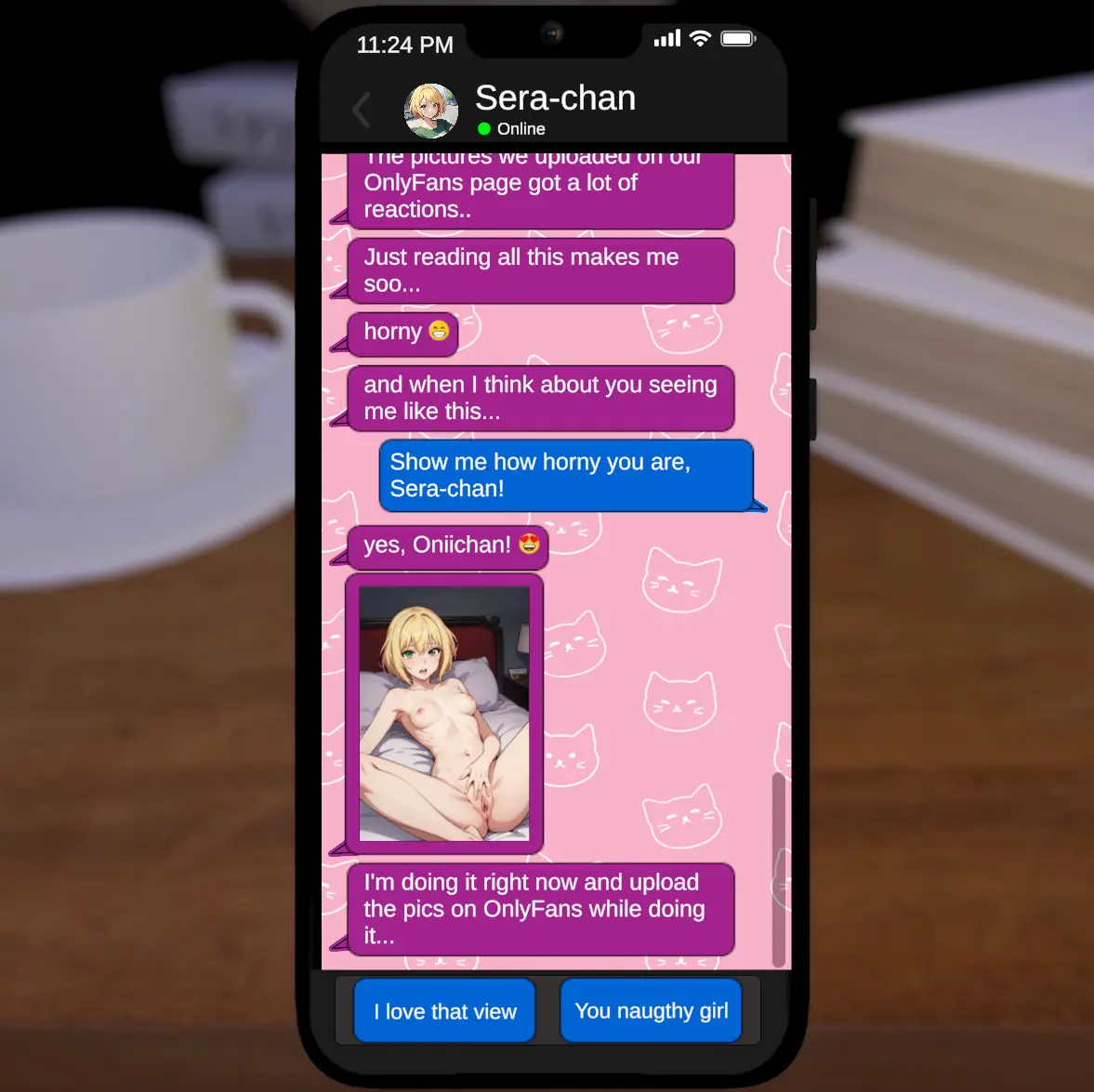 Enjoy chatting with Sera-chan in this hentai chat game. As the story progresses, you can unlock various pictures of her and develop the relationship from innocent photo sharing up to so much more.