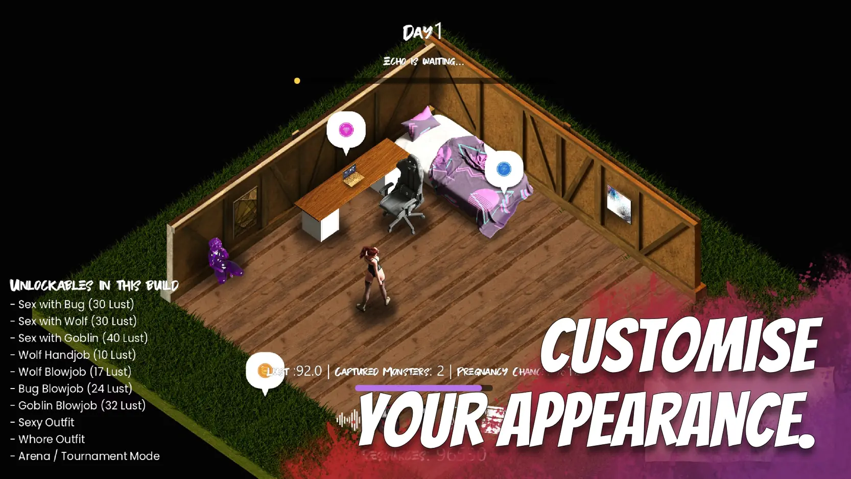 You can enter your creatures in Arenas and Tournaments to earn rewards and prove your ranch’s strength. Back at home, relax in your Bedroom, where you can buy outfits, decorate, and, if you’re a Patreon supporter, unlock special cheats and perks.