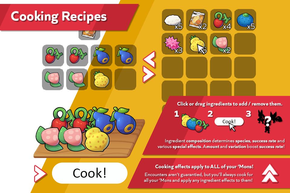 Gather ingredients and cook up recipes to attract various ‘Mons to your campsite.