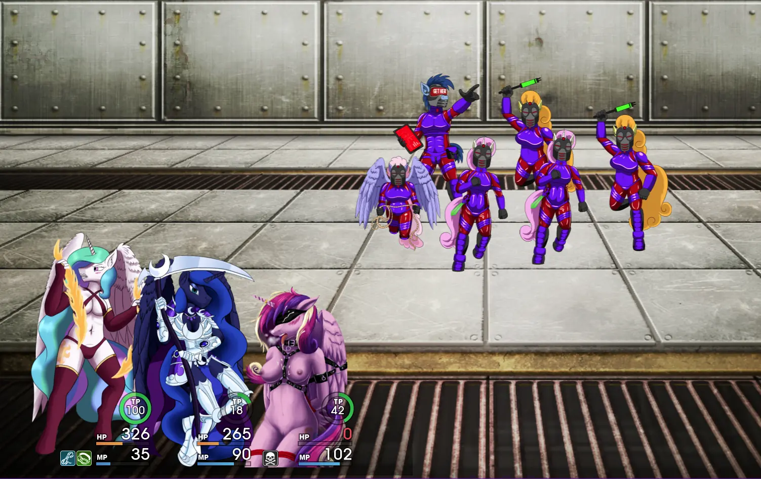 King Sombra has risen yet again and has teamed up with Flim and Flam, Queen Chrysalis, and some other villains (that I haven’t chosen yet) to abduct the elements of harmony, forcing them into sex slavery. With no other defenders available (Probably because they’ve been kidnapped too) it falls to the original princesses of equestria (and Cadance) to mount a rescue.​