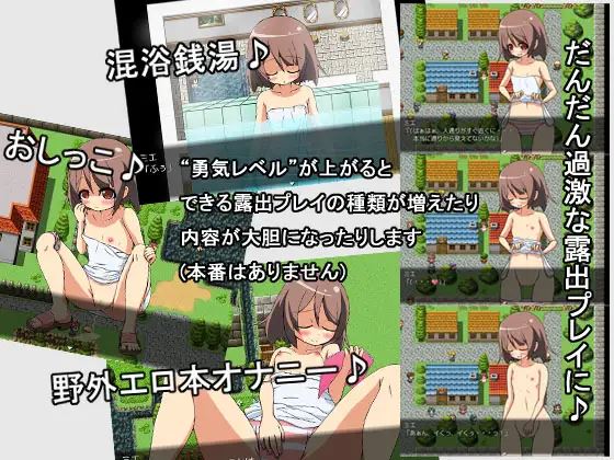 The main character “Mie” is interested in exposure play, but a little shy girl enjoys exposure play in a distant town where you do not know the face. At first, you pretend to be careless If you have the courage to be exposed (the level of courage), you can go into a mixed bathing public bath , masturbate outside, take off your pants, and put it in. It’s a panchira event with your pants off. If you wake up something else … If the courage level goes up, the content of the exposure play will gradually become radical and you will be able to see and show masturbation, so let’s raise the courage level and enjoy the exposure play.