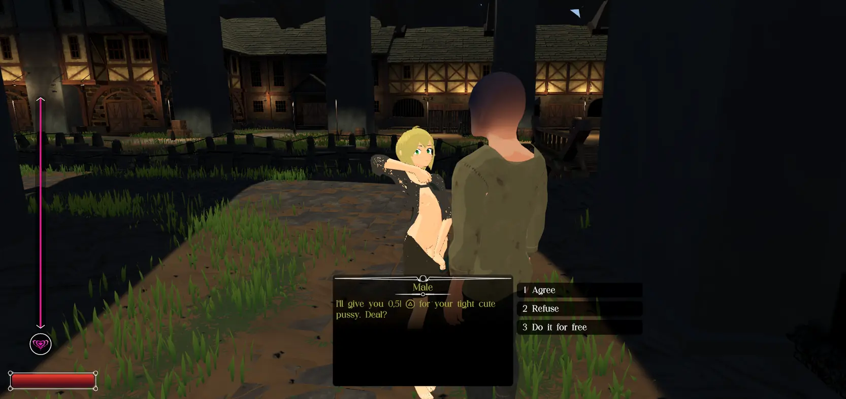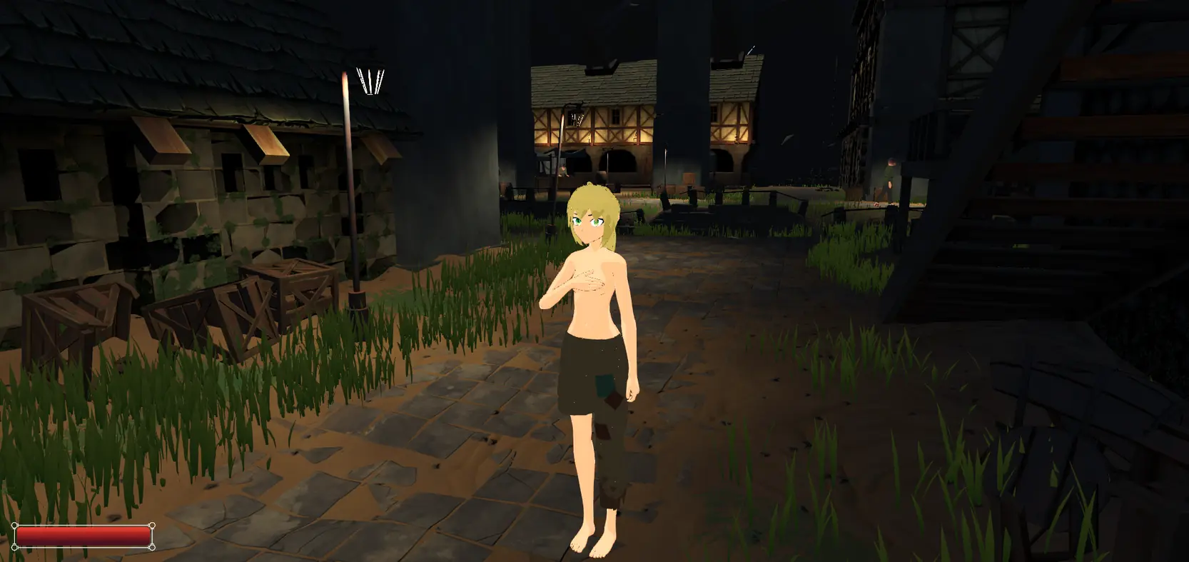 Hi! Hello! This is my hobby project, brought to the state of a working technical demo. The game takes place in a medieval setting. You control a beggar girl named Rumi who is trying to earn money by any means necessary. Honestly, in the game so far, in addition to looting boxes and begging, you can only engage in prostitution to earn money for food.​