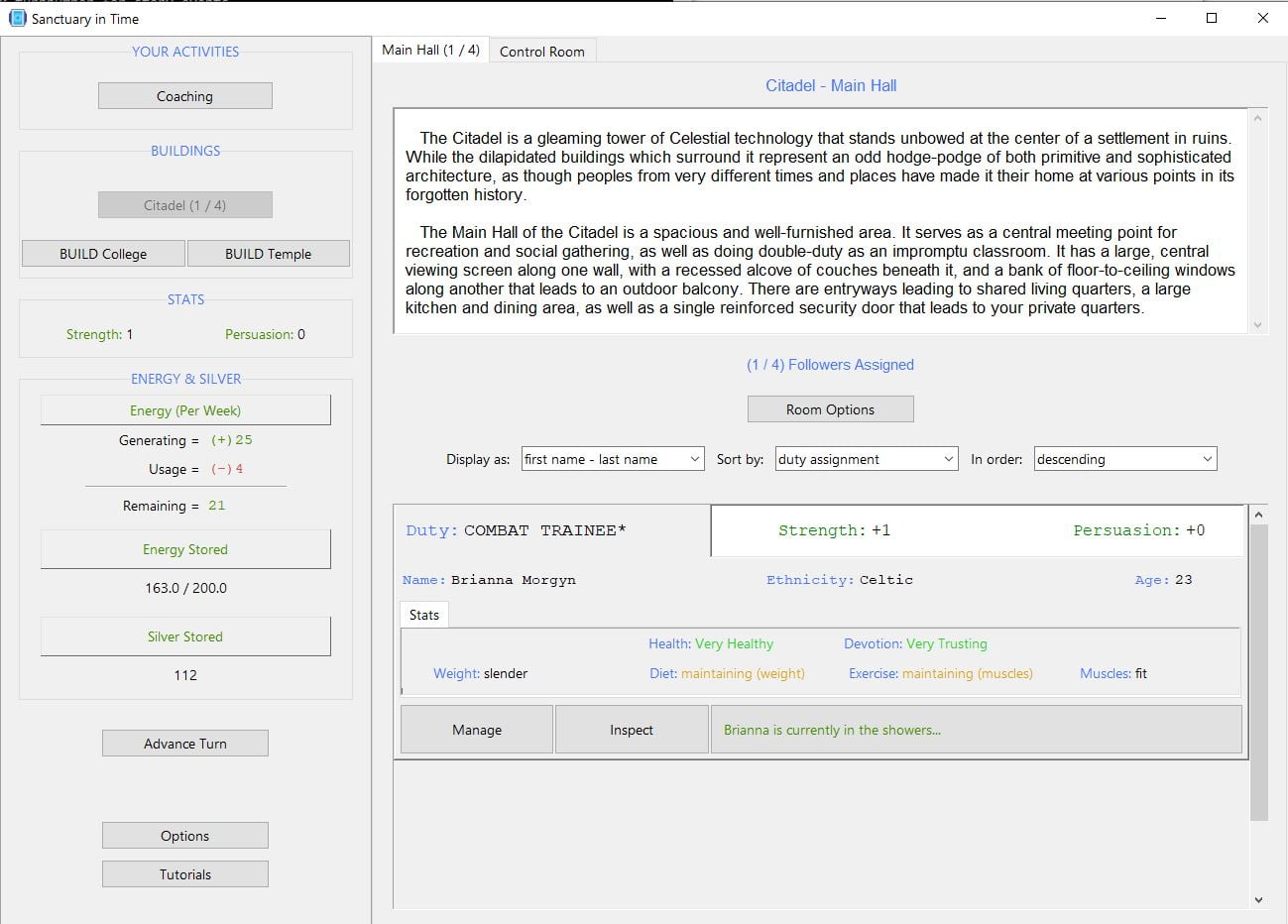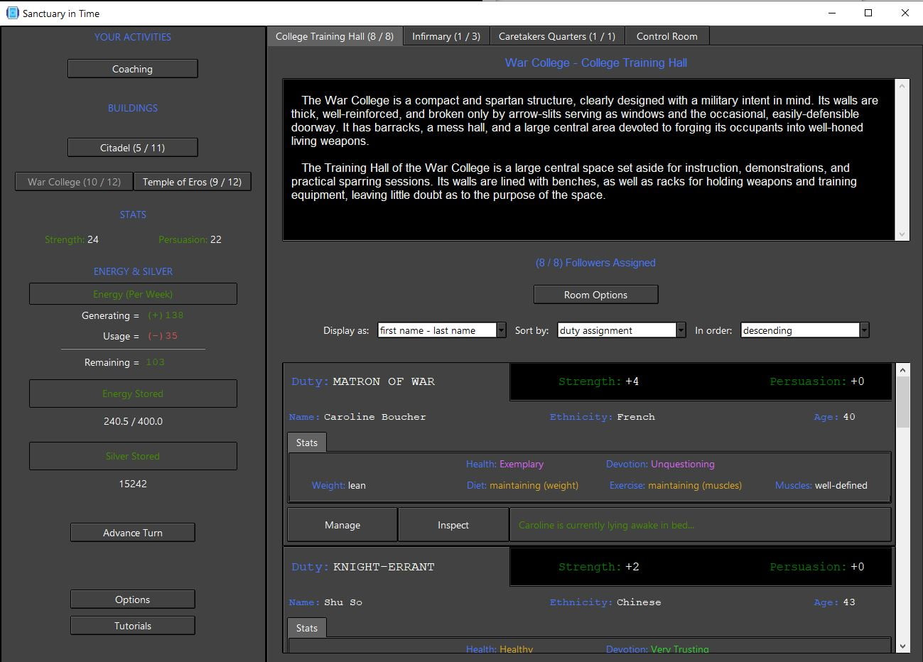 - Updated logic used by skill checks in Arena Victoria (where all followers can use Combat or Courtship to confront challenges). Now, their chances to succeed on these checks may be penalized to varying degrees depending on how severe their current personality-based limitations are.