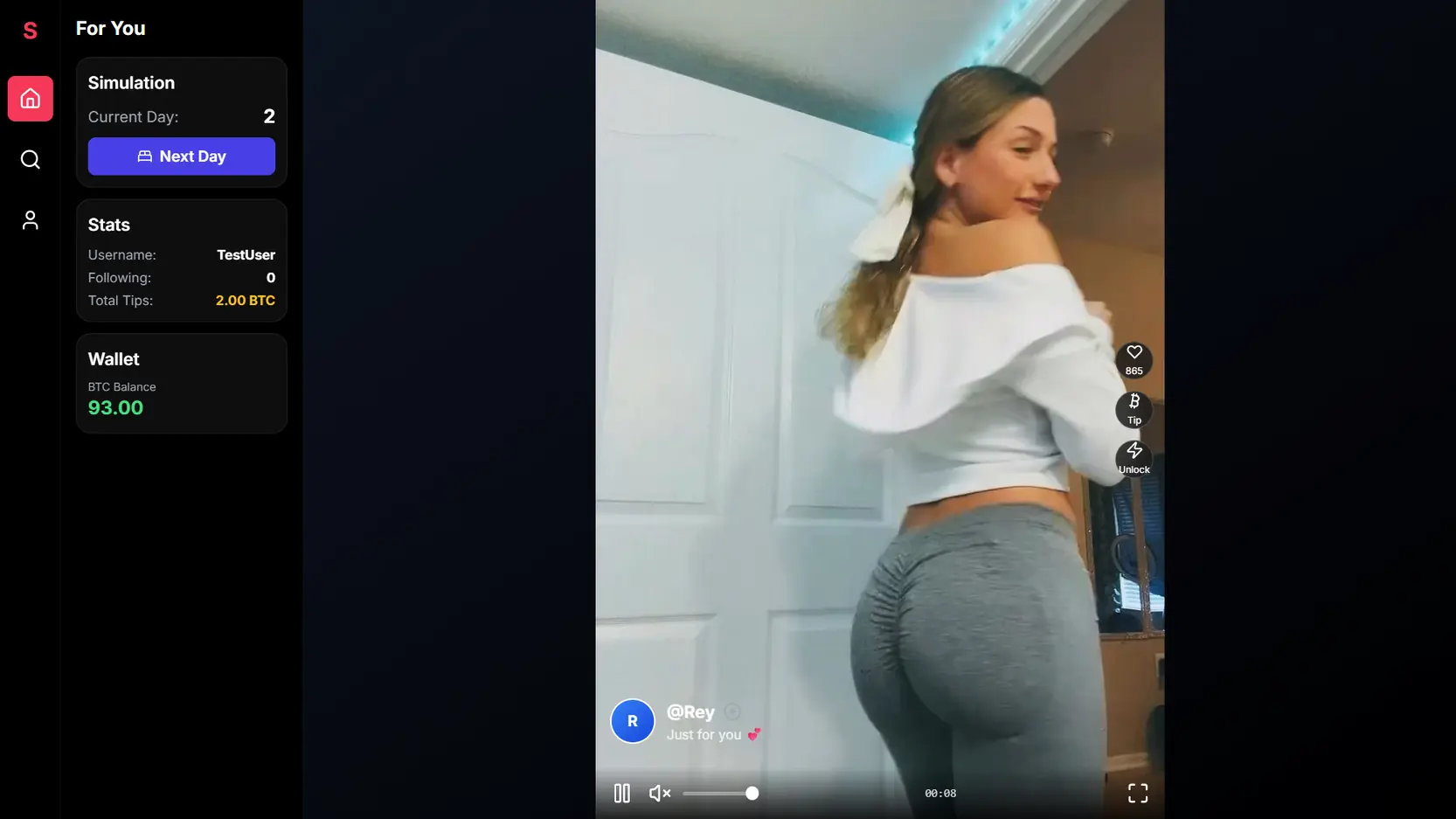 ScrollTok: Where every scroll has a price. Welcome to ScrollTok, the most exclusive and addictive video feed on the web. Dive into an endless stream of captivating content from four unique creators, with new videos dropping into your ‘For You’ page every single day. But this is more than just an app! It’s a life simulation. You start with a daily stipend of BTC, but you’ll have to manage it carefully. Pay for your daily rent, food, and even your ScrollTok subscription fee. Every choice matters. Will you spend your balance tipping your favorite creators and quick-unlocking their next video, or will you save your funds to ensure you don’t go bankrupt? Your goal is to survive for 30 days to unlock every video and see what happens.​