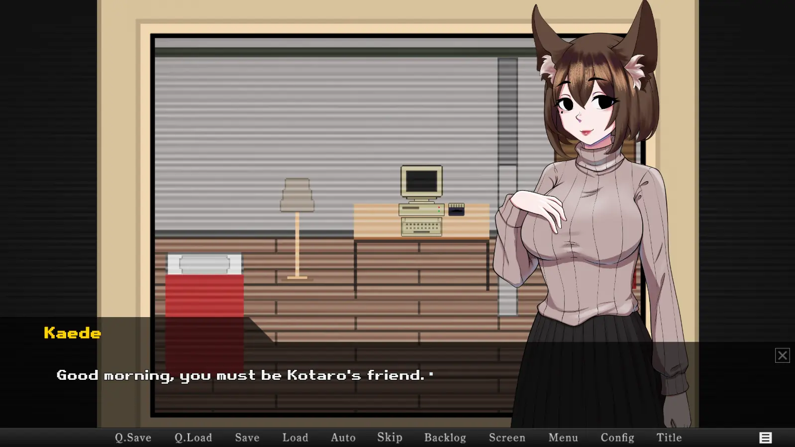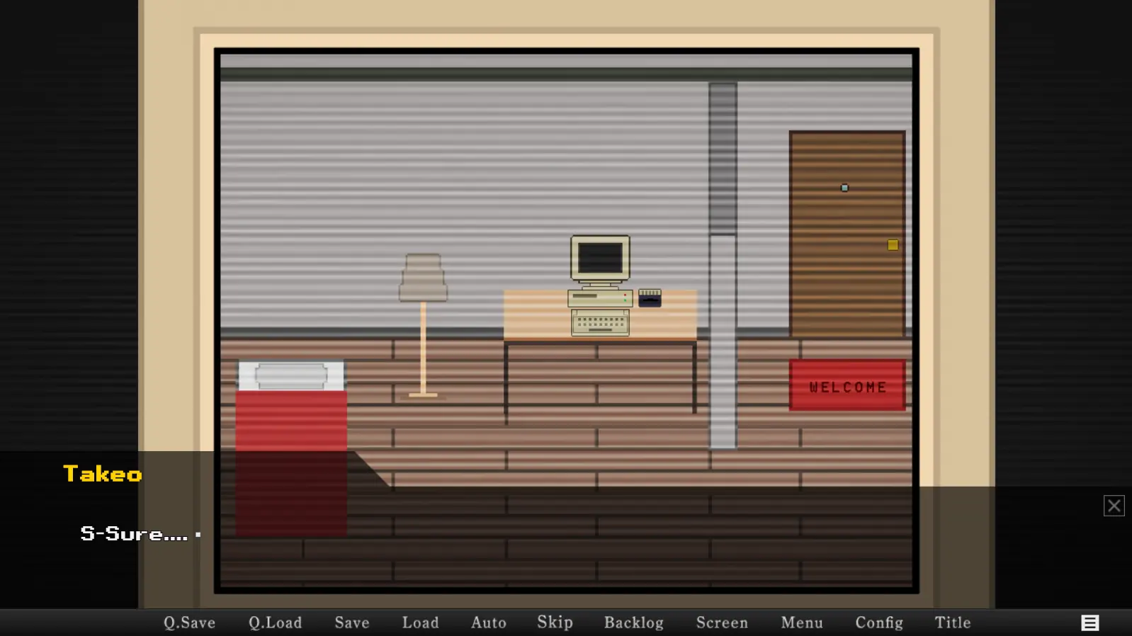 This is a short visual novel with a few point and click elements. The story revolves around Takeo, a drunkenly drunk salaried employee who promised his best friend that he would help him with his new project without even knowing what it was about.