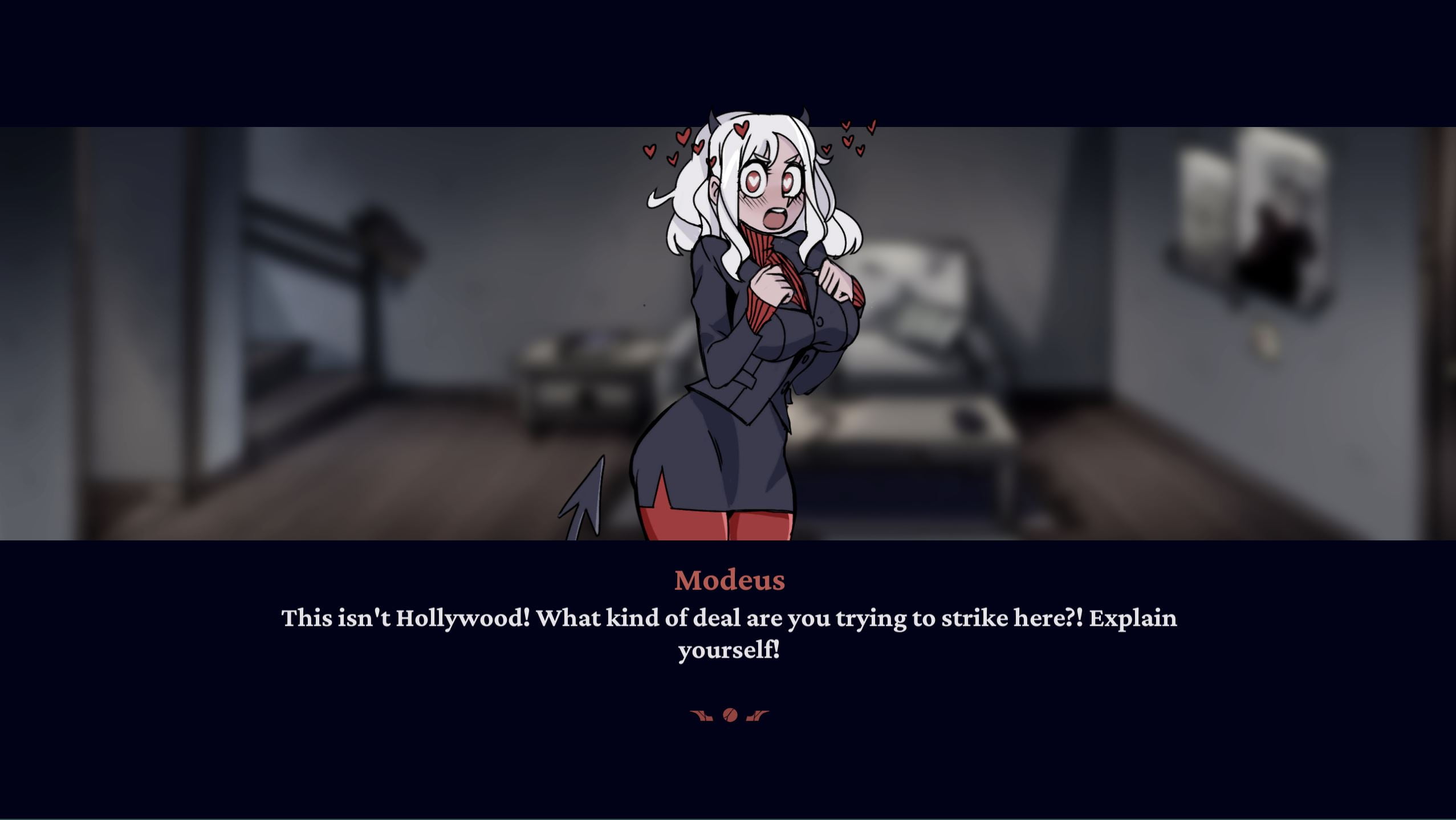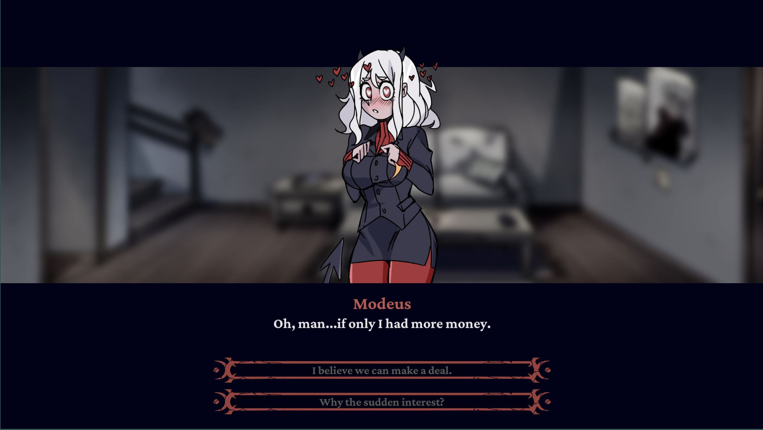 “‘An Evening with Modeus” is a visual-novel style peek into Helltaker’s daily life, featuring Modeus. The short game is intended to be a lighthearted and warm, dialogue-rich experience for all discerning men and women of culture.​