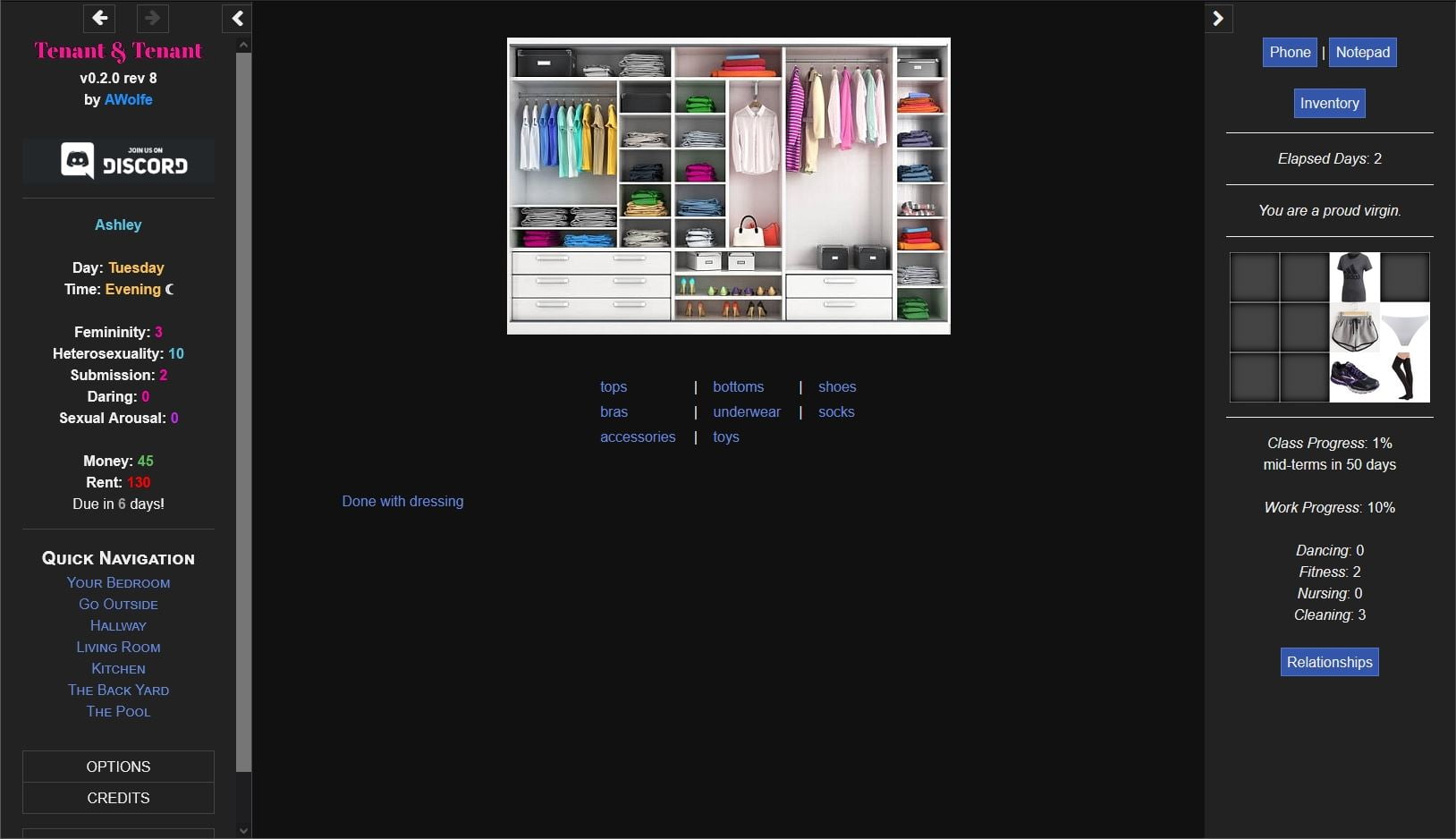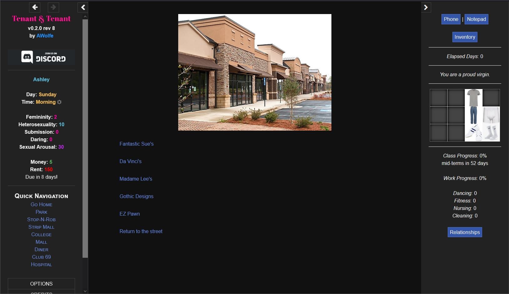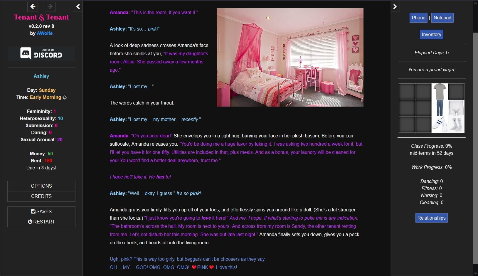 Tenant & Tenant is a TF game about a recently-orphaned effeminate young man going off to college and living with two hot women… who have plans for him (as do most of the other people that he meets). Choose your major in college. Go to classes. Find a job (or not). Meet people, many of whom can be romanced. All while you grow as a person and discover who you really are.​