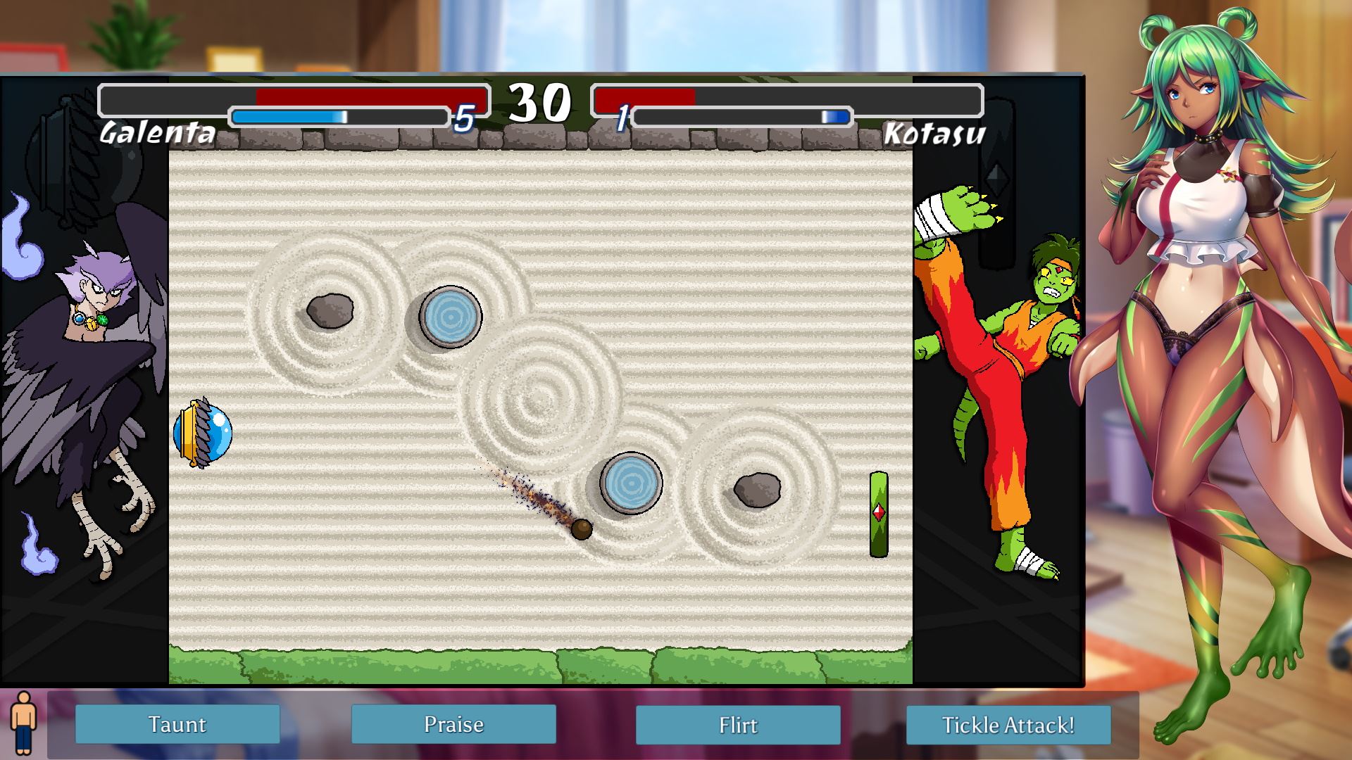 This episode is mainly a visual novel in it’s story segments, but the game you play against Tainara is a fully featured pong-like action game with fighting game inspired mechanics and 7 unique playable characters. The game also allows you to trash talk and distract Tainara mid-game to affect the way she plays. There are 4 different ‘base’ sex scene cgs and the way the scenes play out depend on your final win/lose count when you win (or lose) the strip bet.​