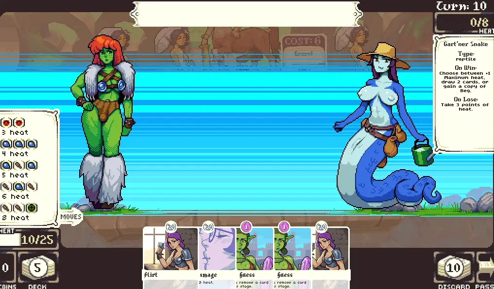 The Succubabe’s Bathhouse is a deckbuilding game in which you fuck monsters and assemble your deck at the same time. Cards will appear on stage which you can purchase with purple coins. Monsters will also appear, and can be defeated by inflicting heat until they cum. if they cum, you will be rewarded, but if not, you will be punished. Beat the monsters and face a series of stage bosses before finally being granted an audience to the Goddess of Lust herself.​