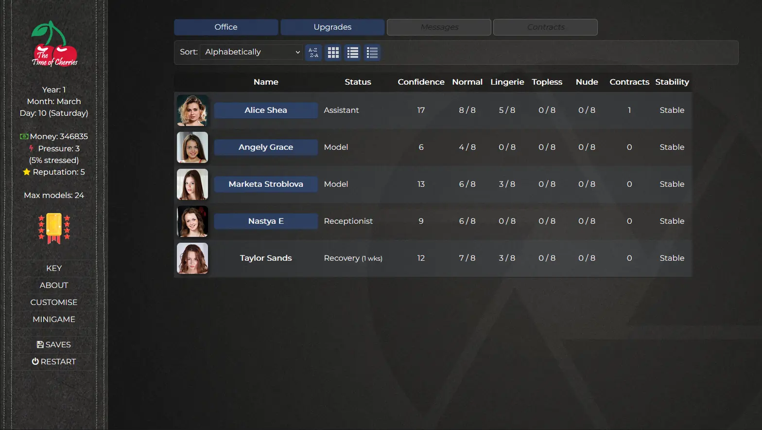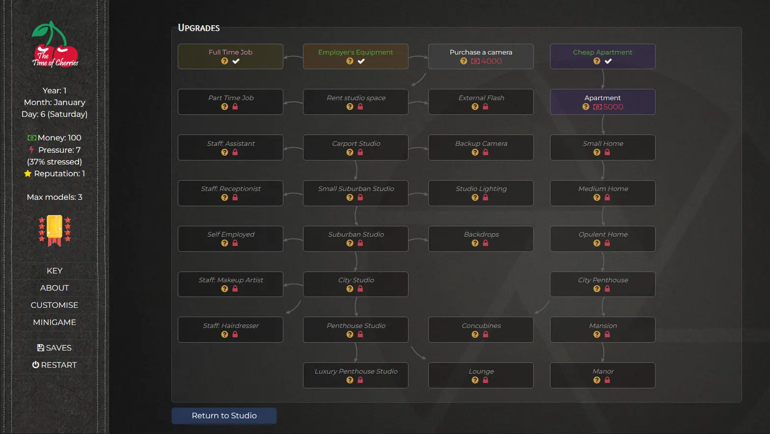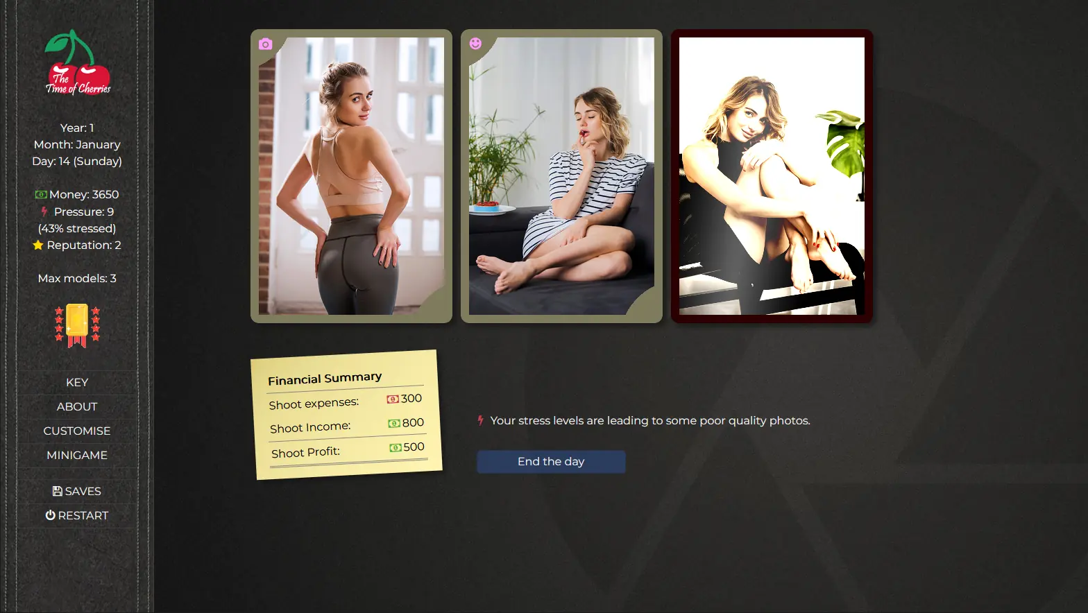 The Time of Cherries is a mostly softcore adult business management simulator where the focus of the game is around managing your own photography studio and achieve your hidden desire. There is a large set collection element to this game where you will be collecting cards for various models that you work with.